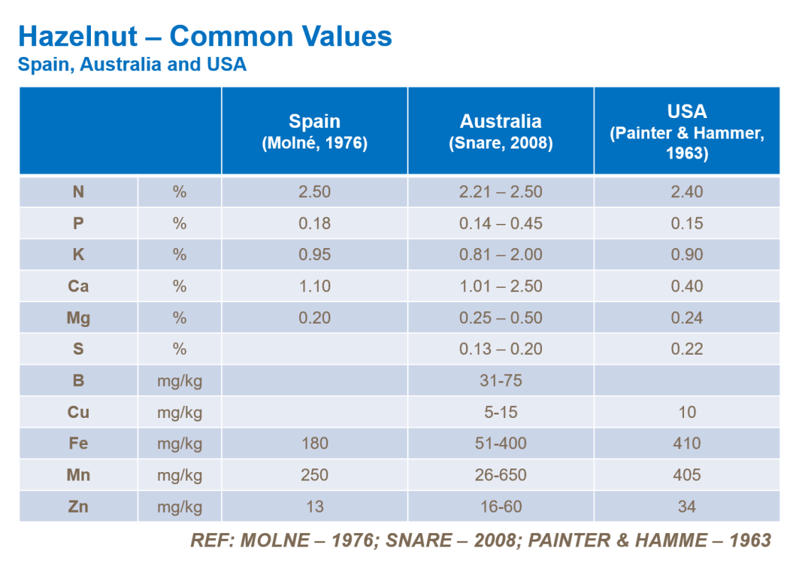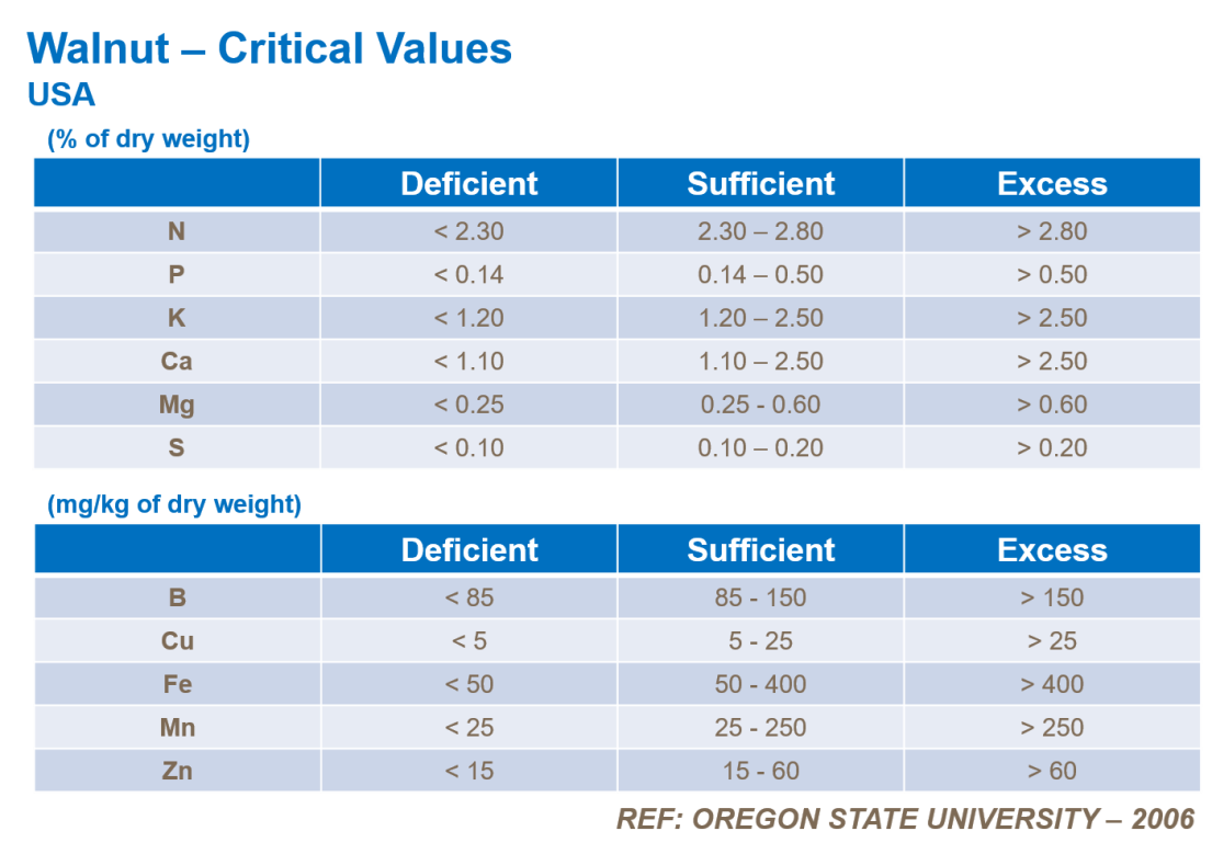 The critical value for potassium varies between 1.0 and 1.8%DM in leaves, dependent on nut type.