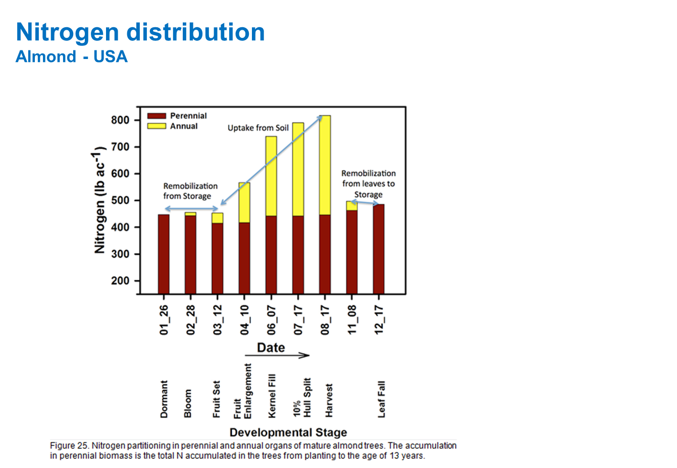 During nut fill, nitrogen in fruit tissue is initially diluted, then builds rapidly as fruit expansion slows, ensuring good proteins and high yields. For this to happen, nitrogen must be continuously available for uptake.
