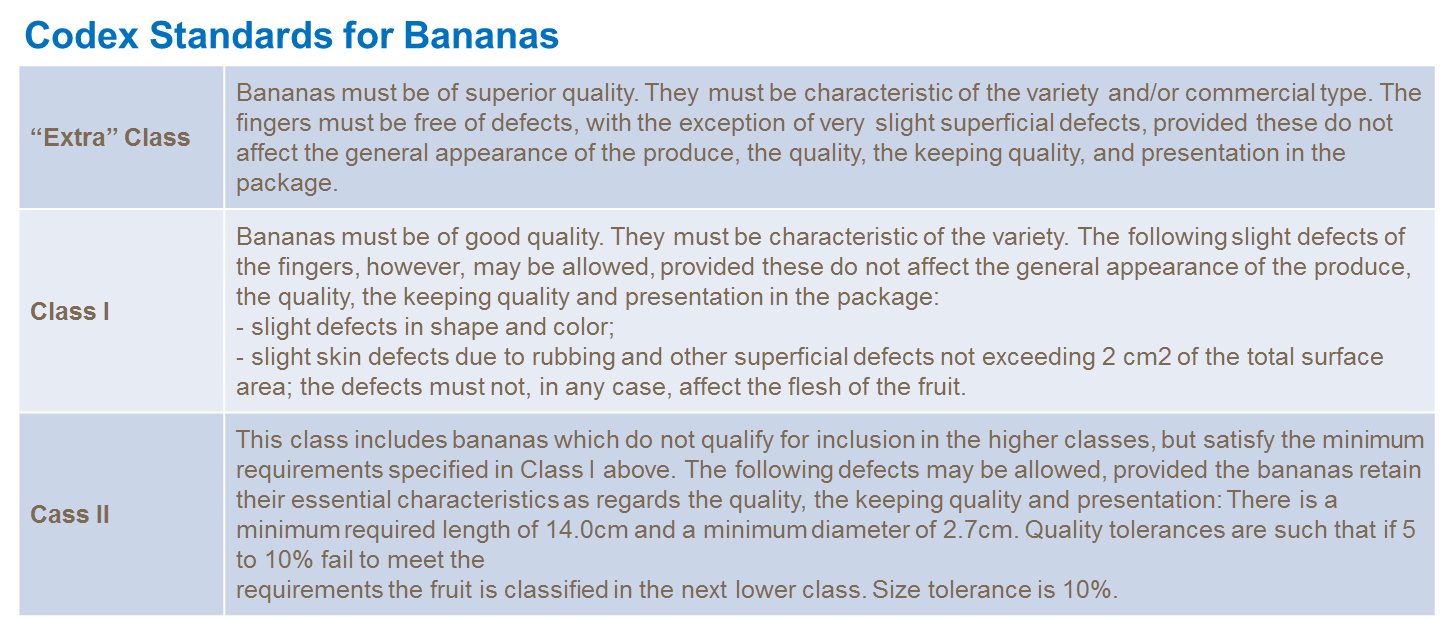 At harvest, bananas destined for export need to be free of significant bruising, blemishes and foreign matter such as insects or dust. Bananas are largely graded into one of three classes, ‘Extra’ ‘Class I’ or ‘Class II’.