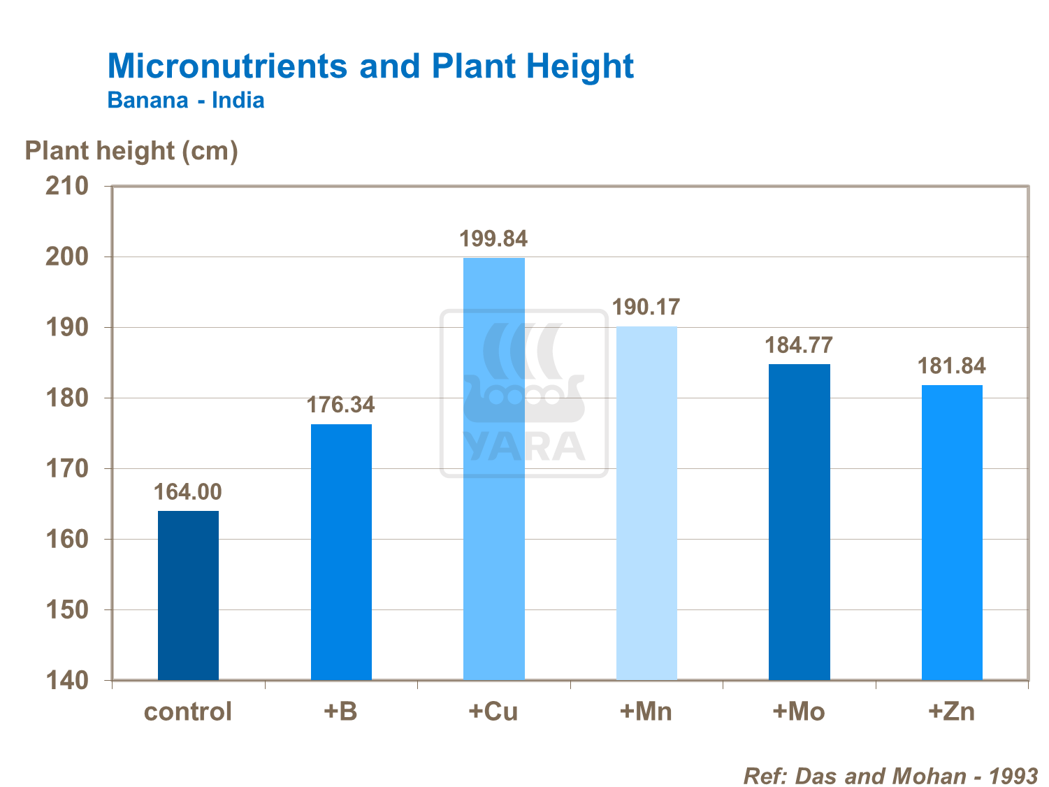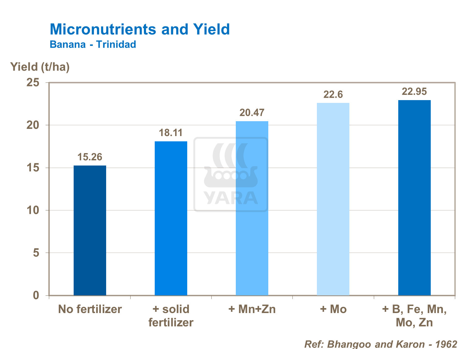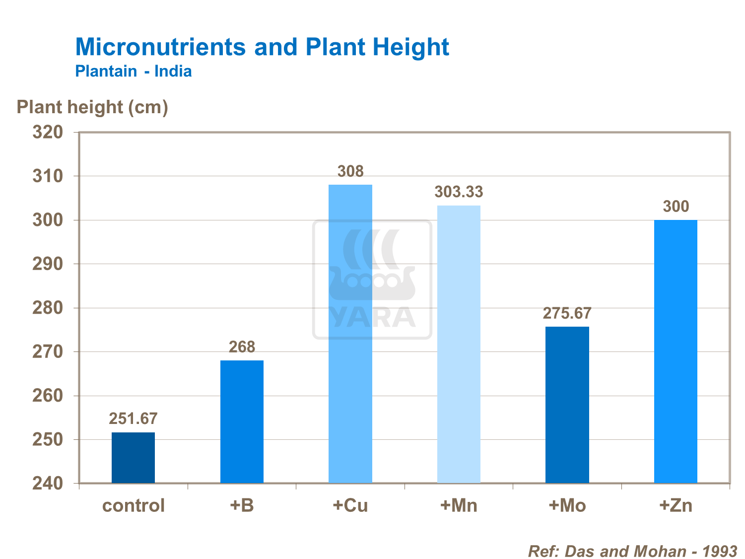 Trials show that where supplies of boron, copper, iron, manganese, molybdenum and zinc are insufficient, plant growth, productive leaf area and yield suffers. This applies equally to plantains as well as bananas.