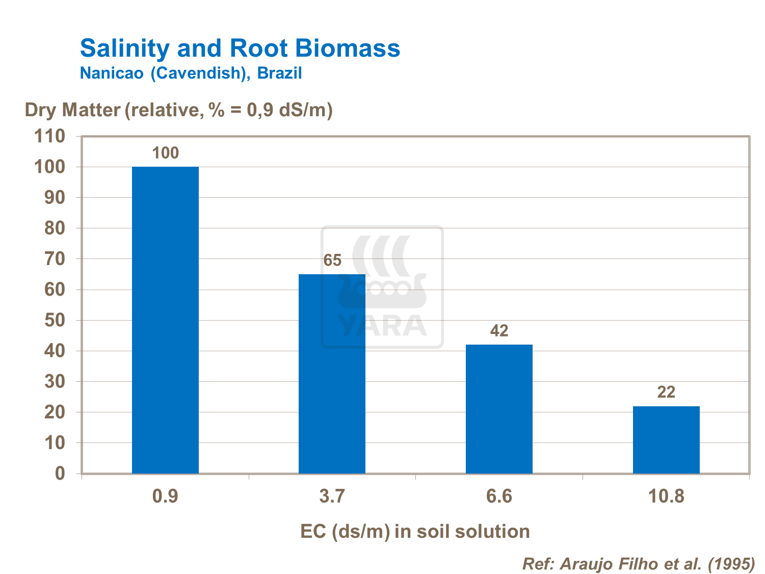 Bananas seem to be more sensitive to sodium than to chlorine. For example, crops will still grow where there is excessive, sucker growth and fruit fill is restricted. AAA type bananas (e.g. Cavendish) are more sensitive than plantains (AAB/ABB types) to both aluminum toxicity and salinity stress. Where possible, growers should irrigate to leach out salts and hence minimize salinity damage.