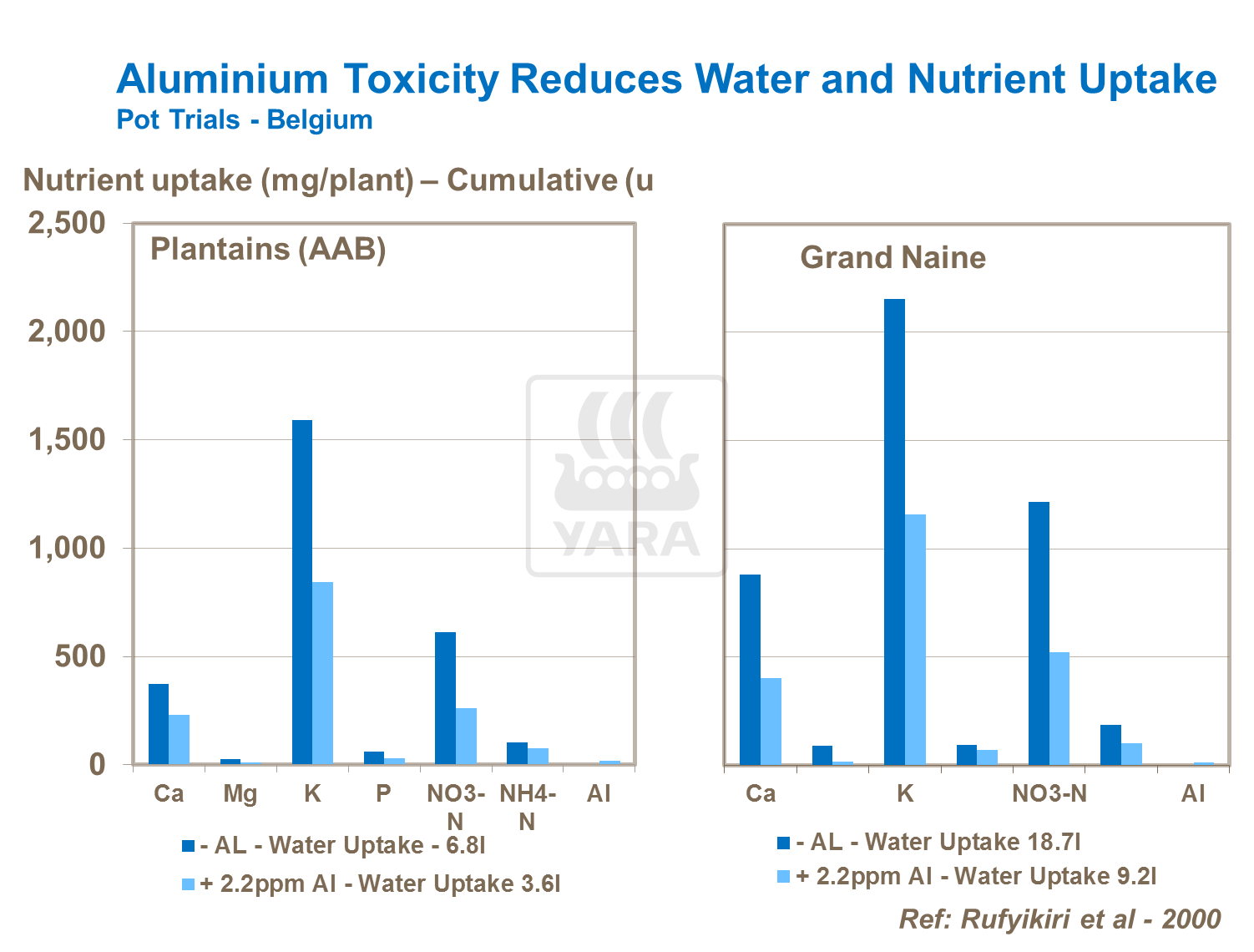 Optimum soil pH is between 6.0 to 6.5, however crops are grown on soils with a wide range of pHs from 4.5 – 8.0, with a range of different yield responses. Soil pH has a direct effect on nutrient availability. Aluminum toxicity symptoms can occur below pH 5.0 and become most severe with decreasing pH values below 4.5. Free aluminum in the soil solution affects uptake of water and nutrients. In trials, with nutrient solutions containing 2.2ppm Al in solution, water uptake was halved after 40 days compared to controls. At the same time, calcium, magnesium, potassium, phosphorus and nitrogen uptake was reduced by around 50%.