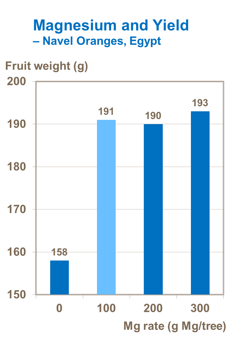 Magnesium applications have been proven to increase yield, as shown in egyptian trials with navel oranges.