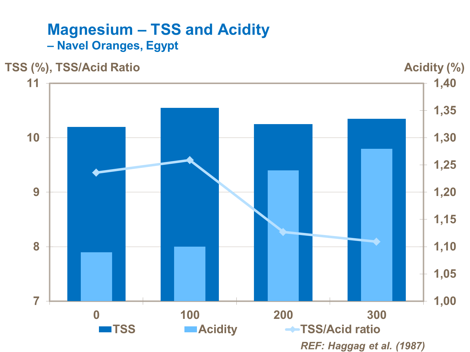 Soil applied magnesium can increase acidity and decrease the TSS/Acid ratio.