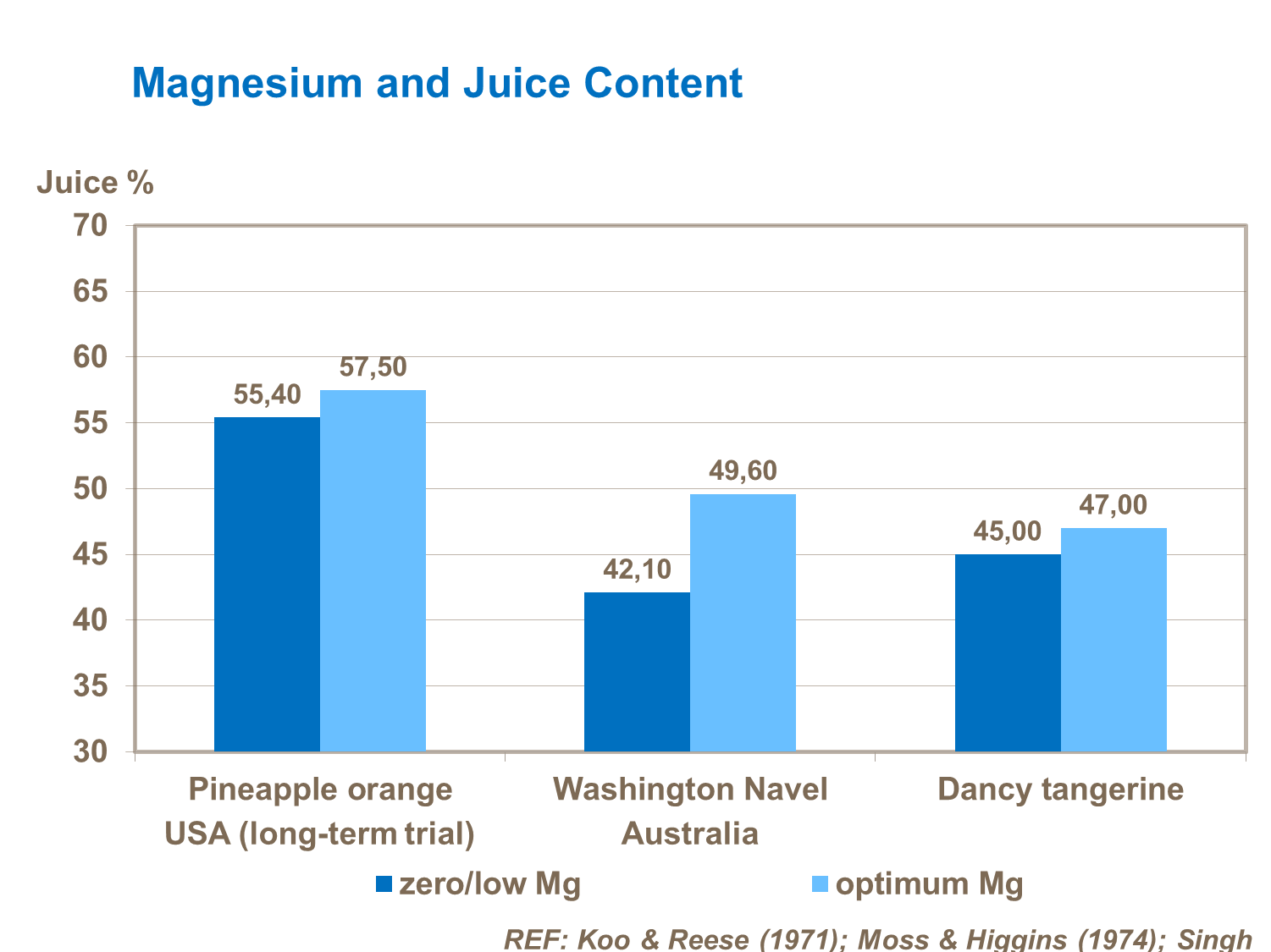 Increases in yield are largely due to increased fruit weight. However, optimum use of magnesium also boosts juice content of the fruit.
