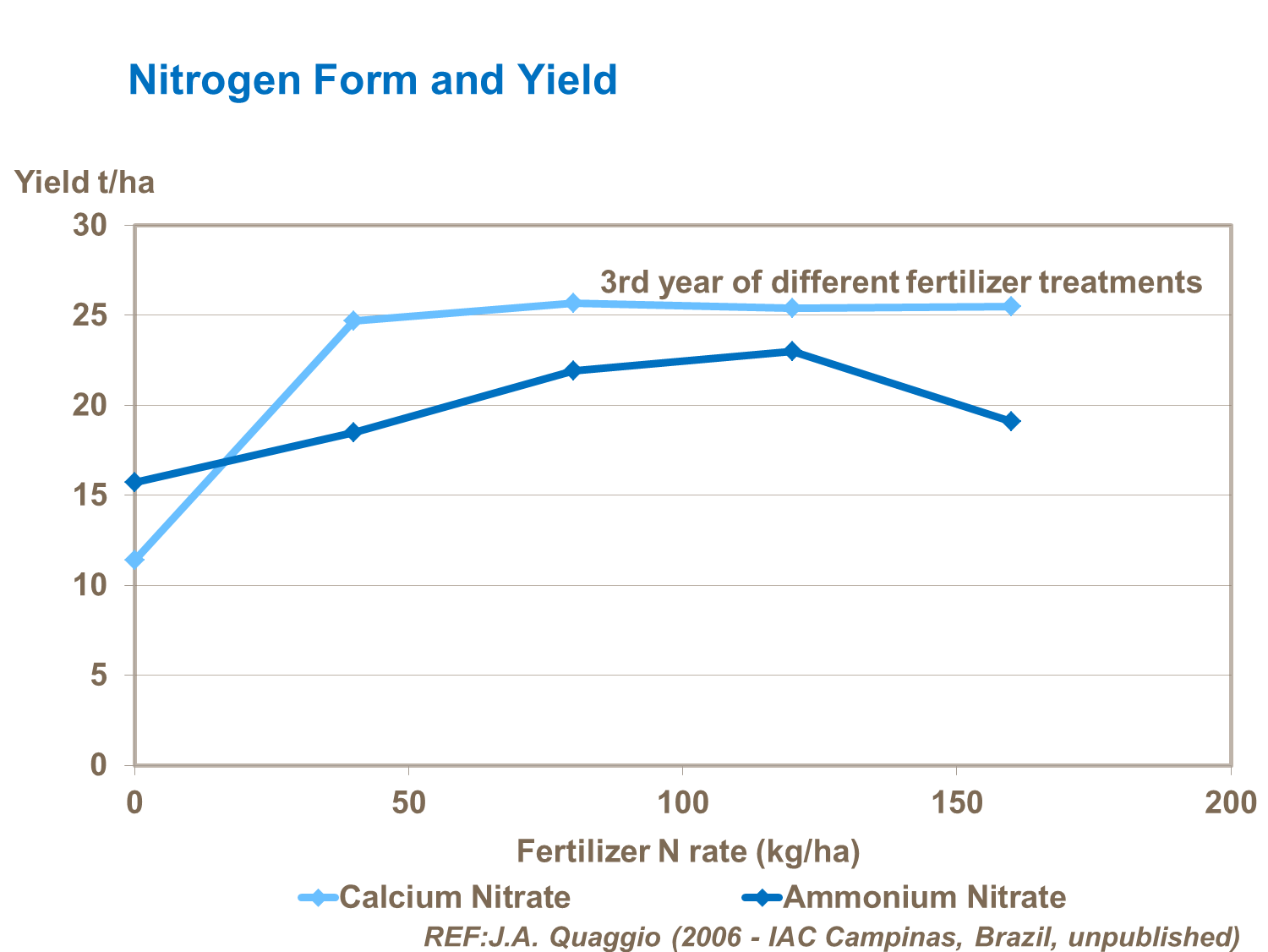 Citrus utilizes nitrogen mostly in the nitrate form although some ammonium is used, and the maximum uptake occurs from N-applications made during the periods of active growth. Also, highest yields have been recorded where nitrogen is applied as calcium nitrate rather than as ammonium nitrate (trials with Valencia Oranges in Brazil).