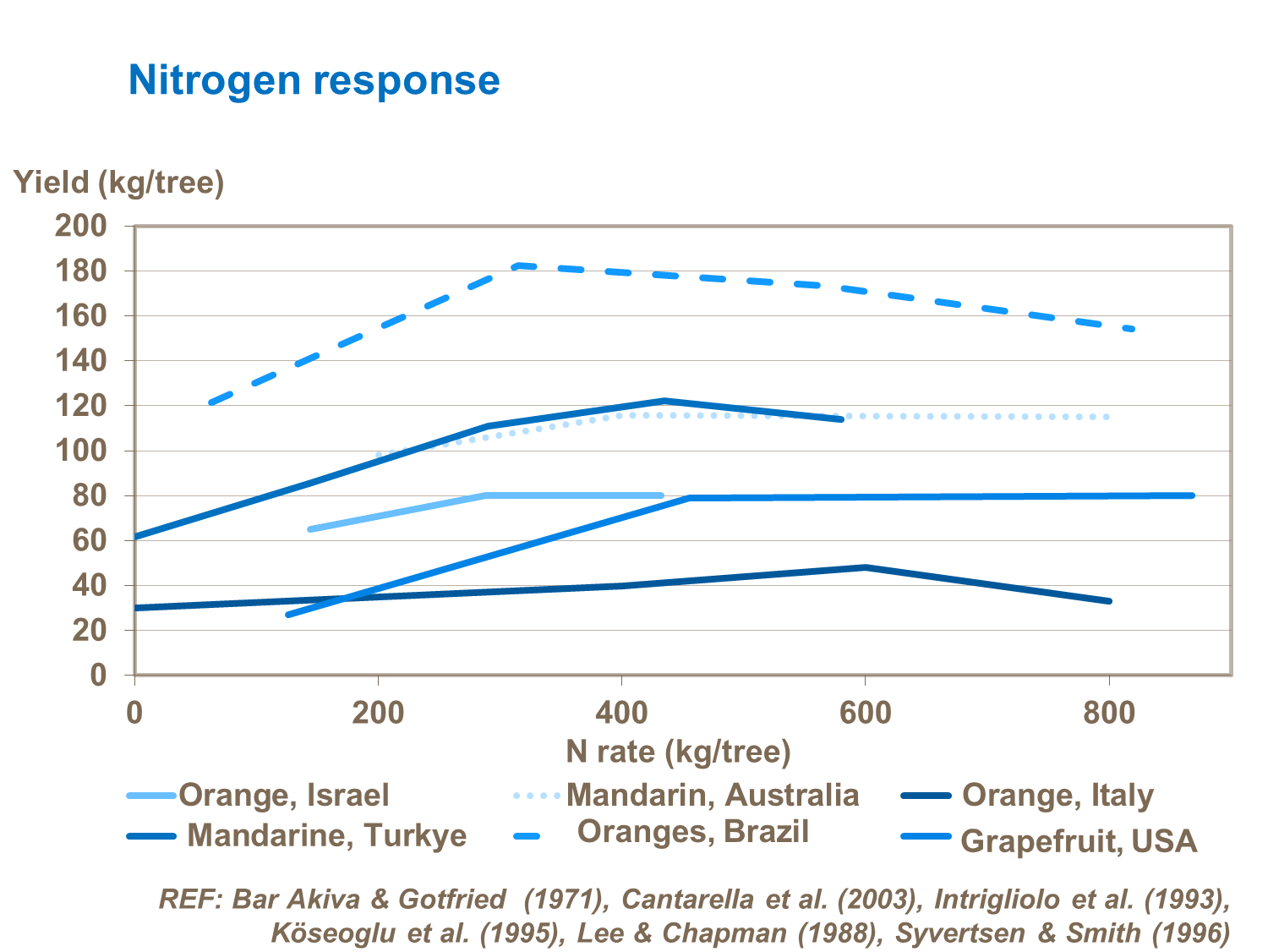 Optimum N-response varies according to citrus tree age. An annual programme of fertilizer-N is needed to ensure long-term productivity by replenishing nitrogen, which is removed by harvested fruit. Nitrogen is timed usually in 3-5 roughly equal split applications made during the citrus growing season and during periods of active root and tree/flower/fruit growth and uptake.