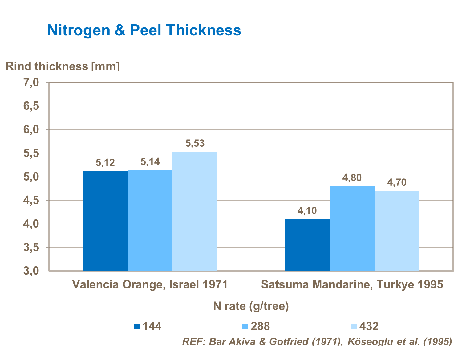 Crops with adequate levels of nitrogen have thicker peel and reduced risk of mechanical damage and disease incidence. Too much nitrogen can make the skin coarse, reduce the juice production and the size of the fruit.