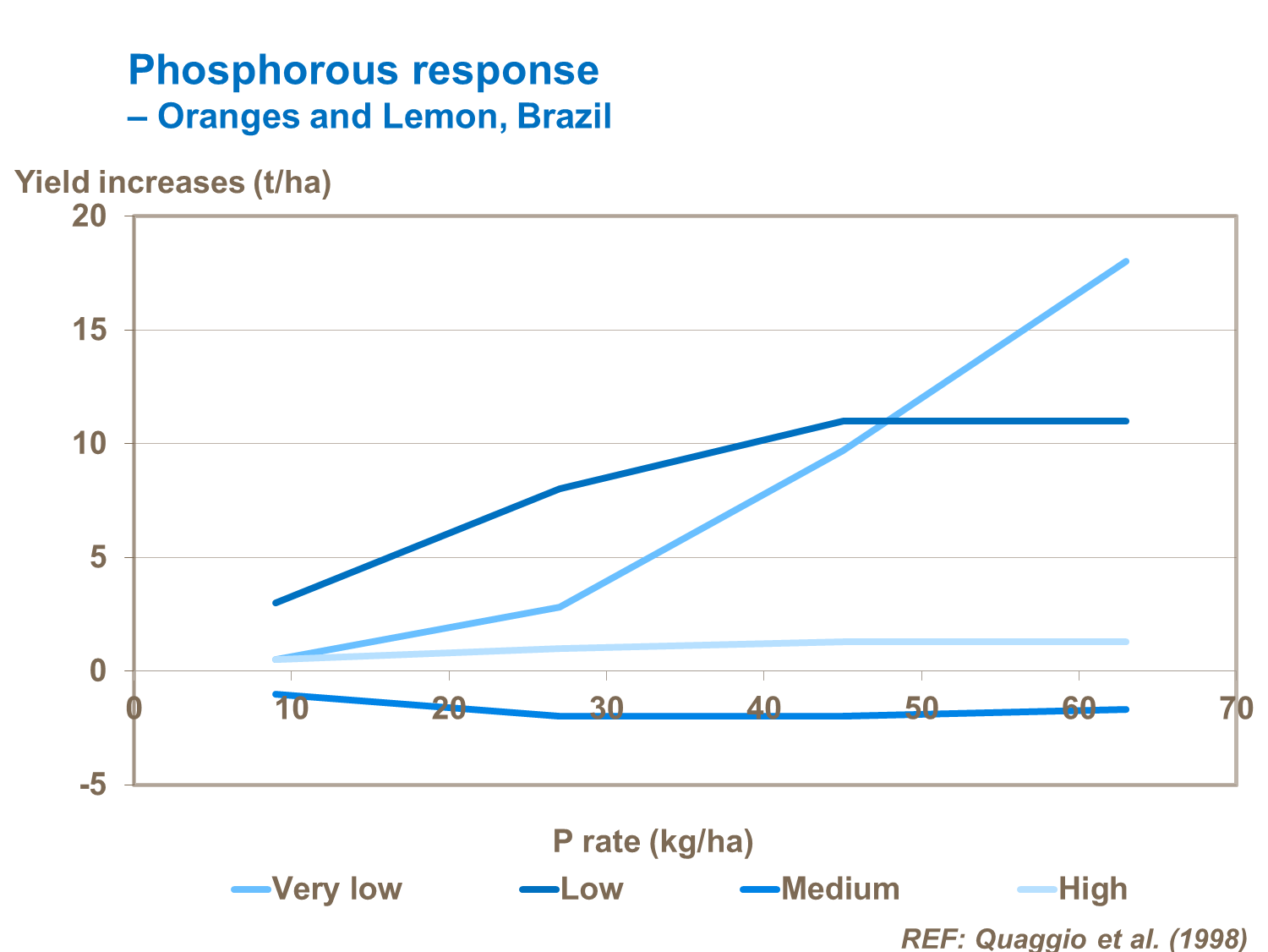 Soils low in phosphate need phosphorus applications, as trials with oranges and lemons in Brazil show. Phosphate uptake occurs throughout the growth period, after flowering and through late fruit maturity. Good availability is important during periods of active root growth e.g. springtime and in between vegetative flushes.