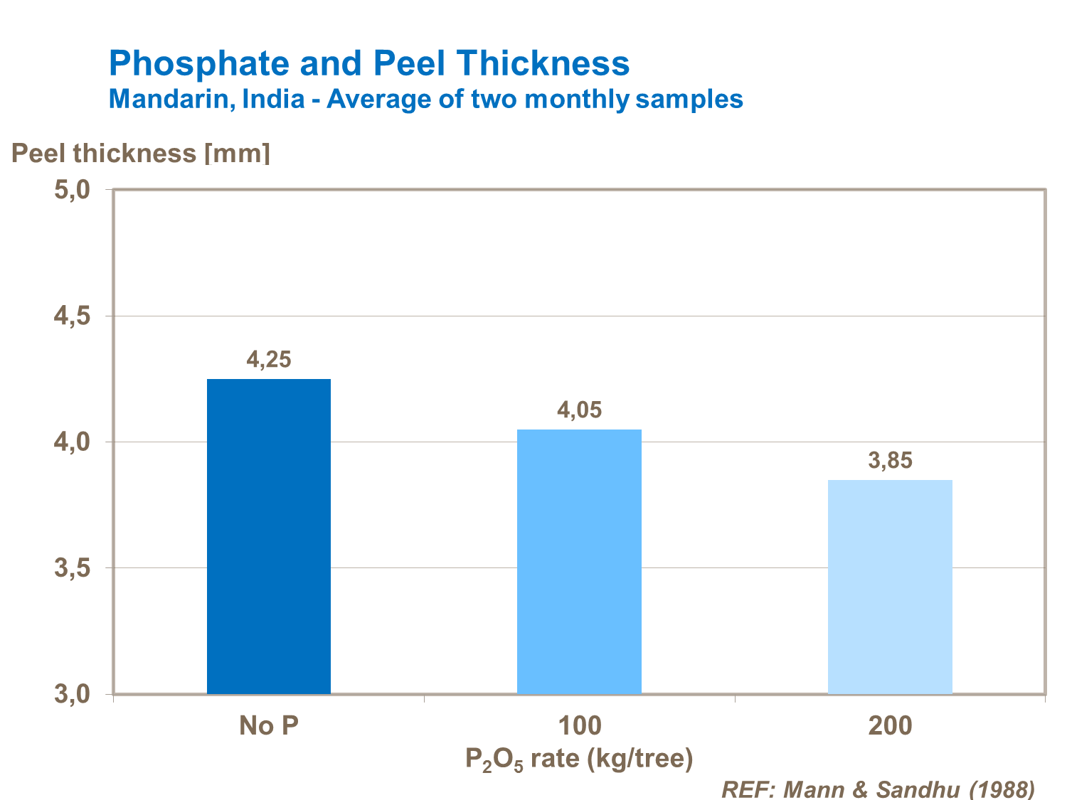 Over supply of phosphorus can reduce peel thickness, as study with mandarins in India shows. Therefore it is important to maintain the right balance between N and P rates.