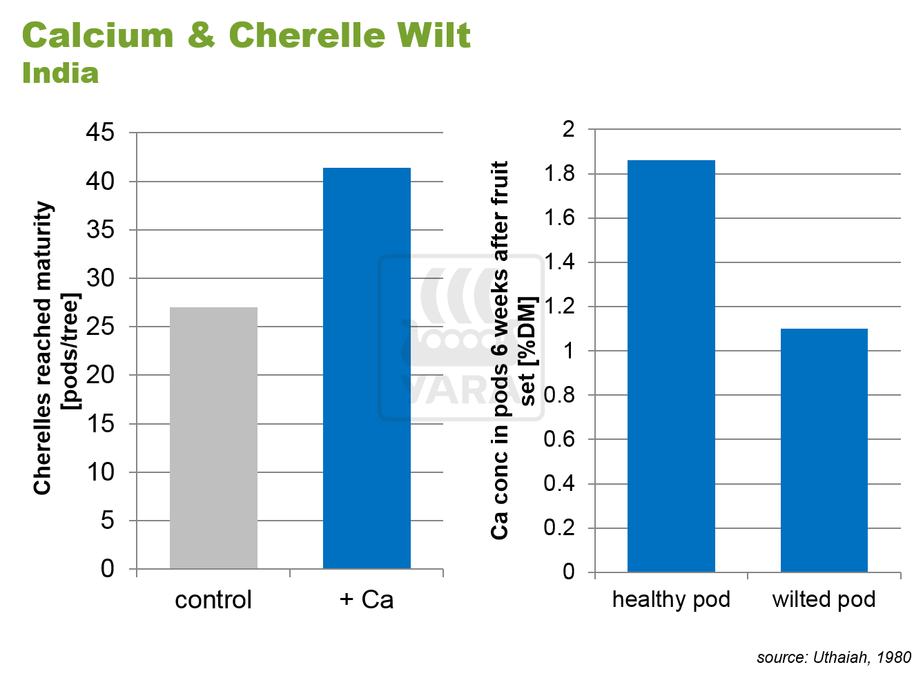 Calcium has been found to increase pod set and reduce cherelle wilt. Hence, application of calcium to the trees as an annual application is beneficial