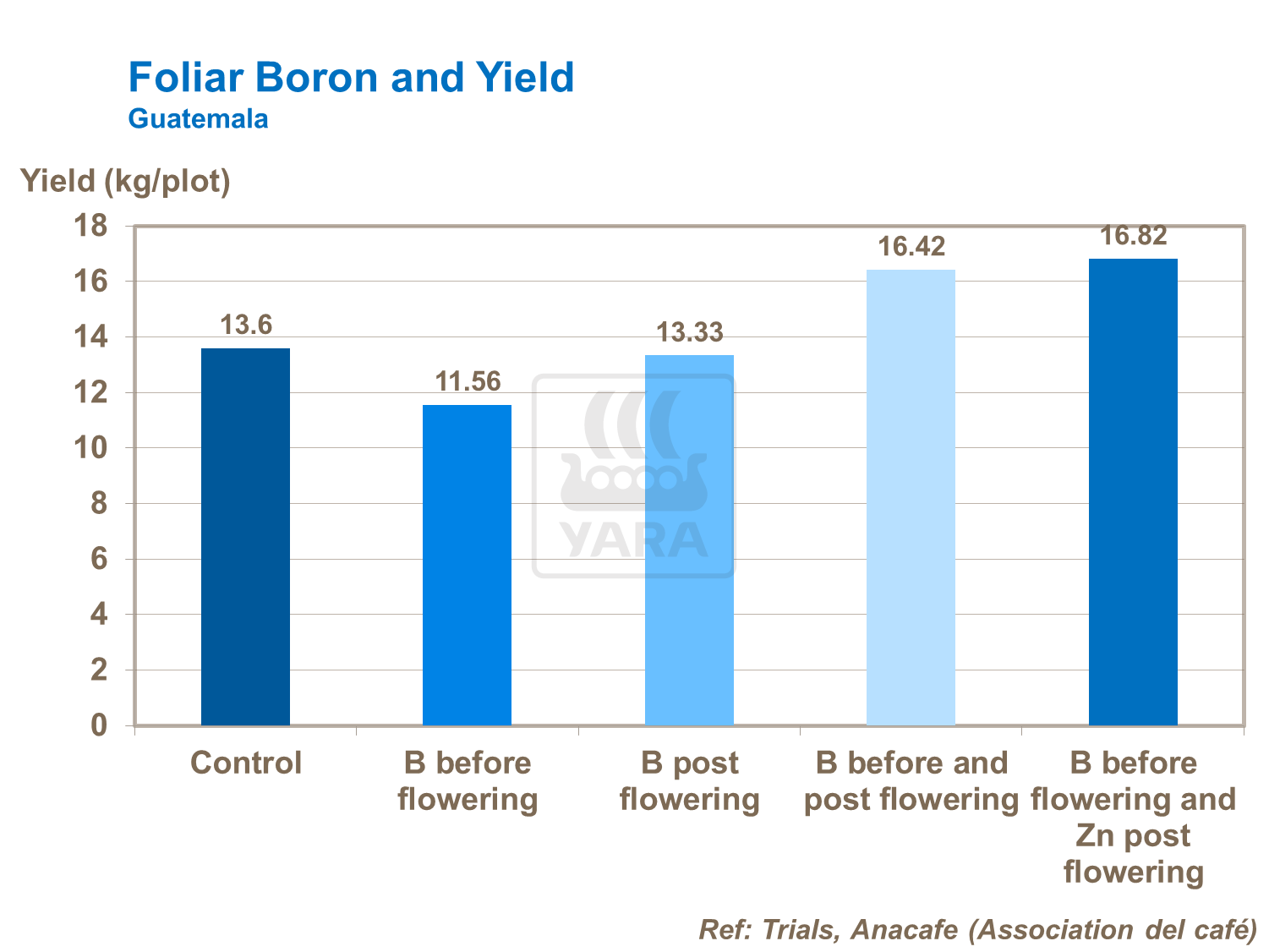 Boron is associated with carbohydrate metabolism and the synthesis of nucleic acids. As a result, where boron is deficient, rooting flowering and fruit set is poor. When using foliar boron, trials suggest that best coffee yield increases come from applications made both before and post flowering, preferably in combination with zinc.