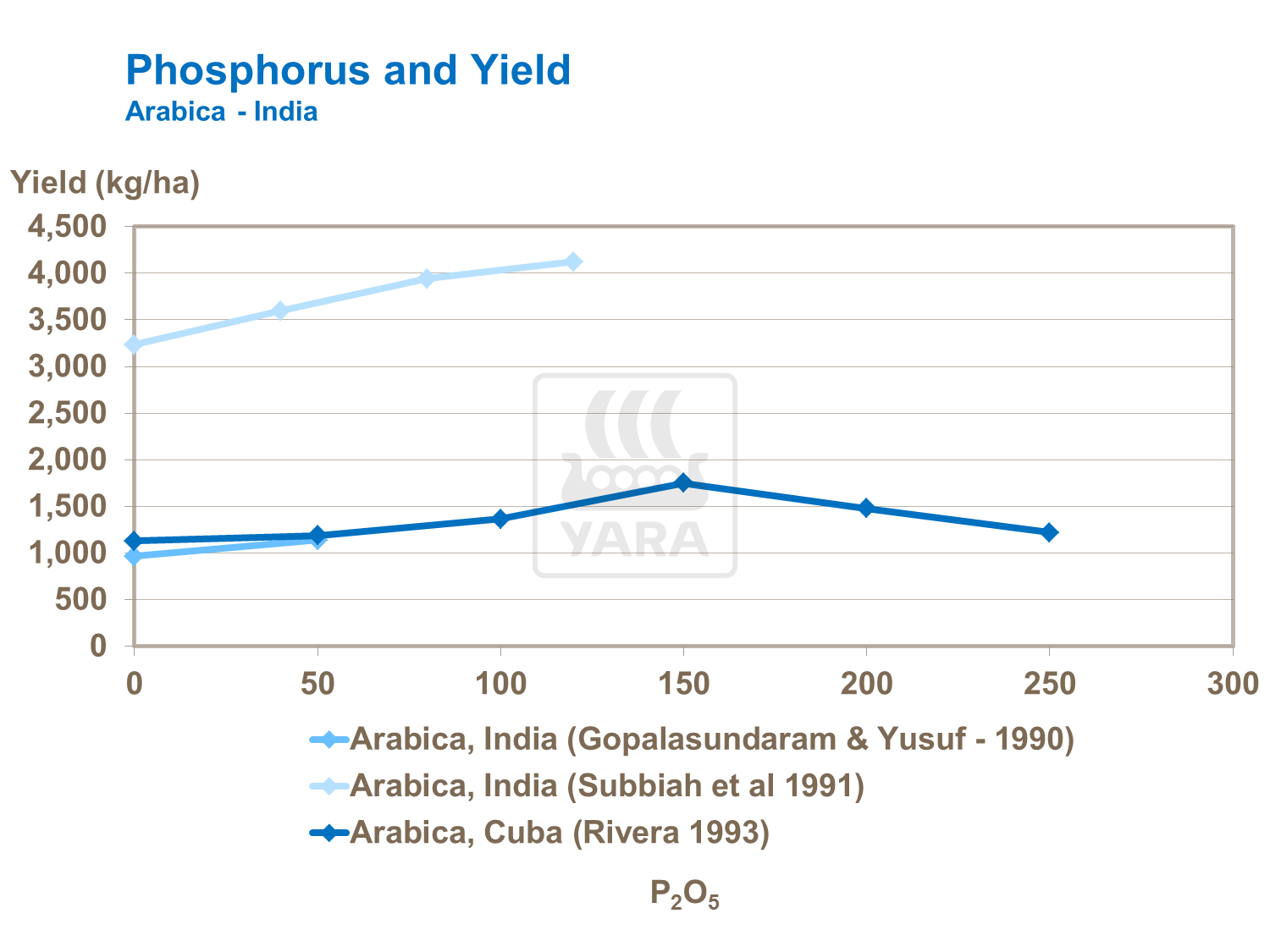Where phosphorus is naturally low or strongly fixed in soils, phosphorus-fertilizer increases berry fruit setting and yield. Responses of up to 150 P2O5kg/ha have been seen on low-phosphorus available soils. However, where phosphorus is applied in excess – as in the Cuban trial – luxury phosphorus uptake creates imbalance with other nutrients, thereby restricting yield.
