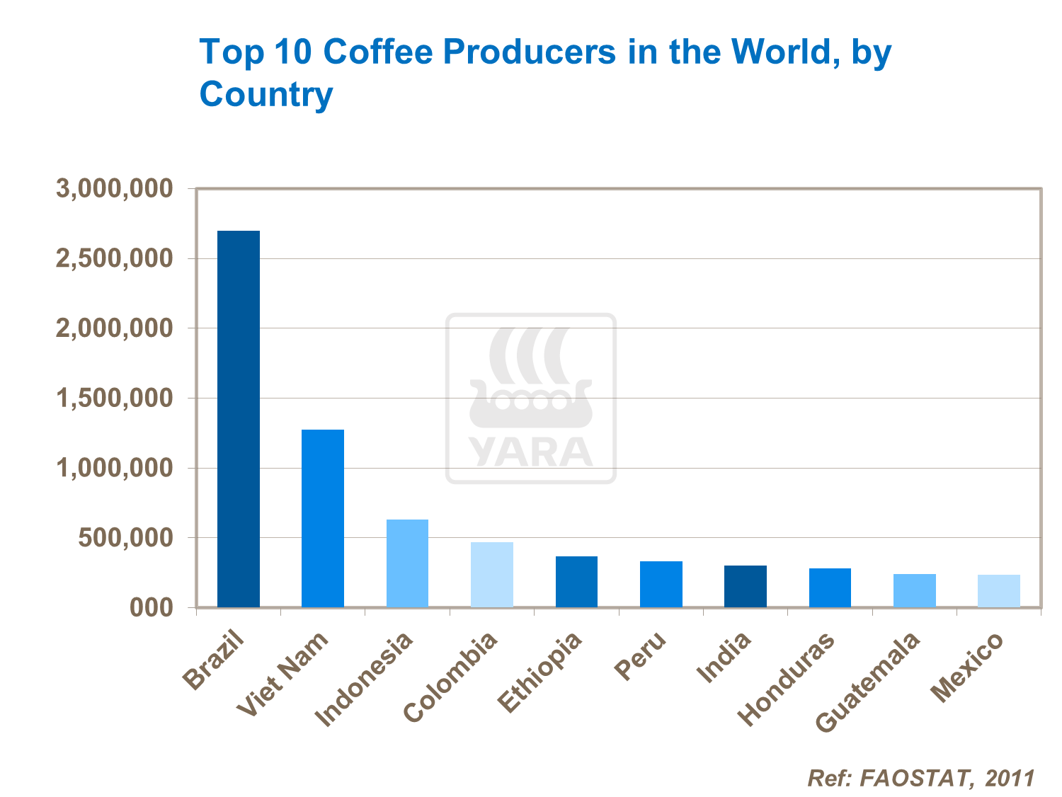 Brazil is the largest exporter with 29% of all exports. Vietnam and Colombia are also major exporters with 16 and 11% of the world’s total exports respectively.