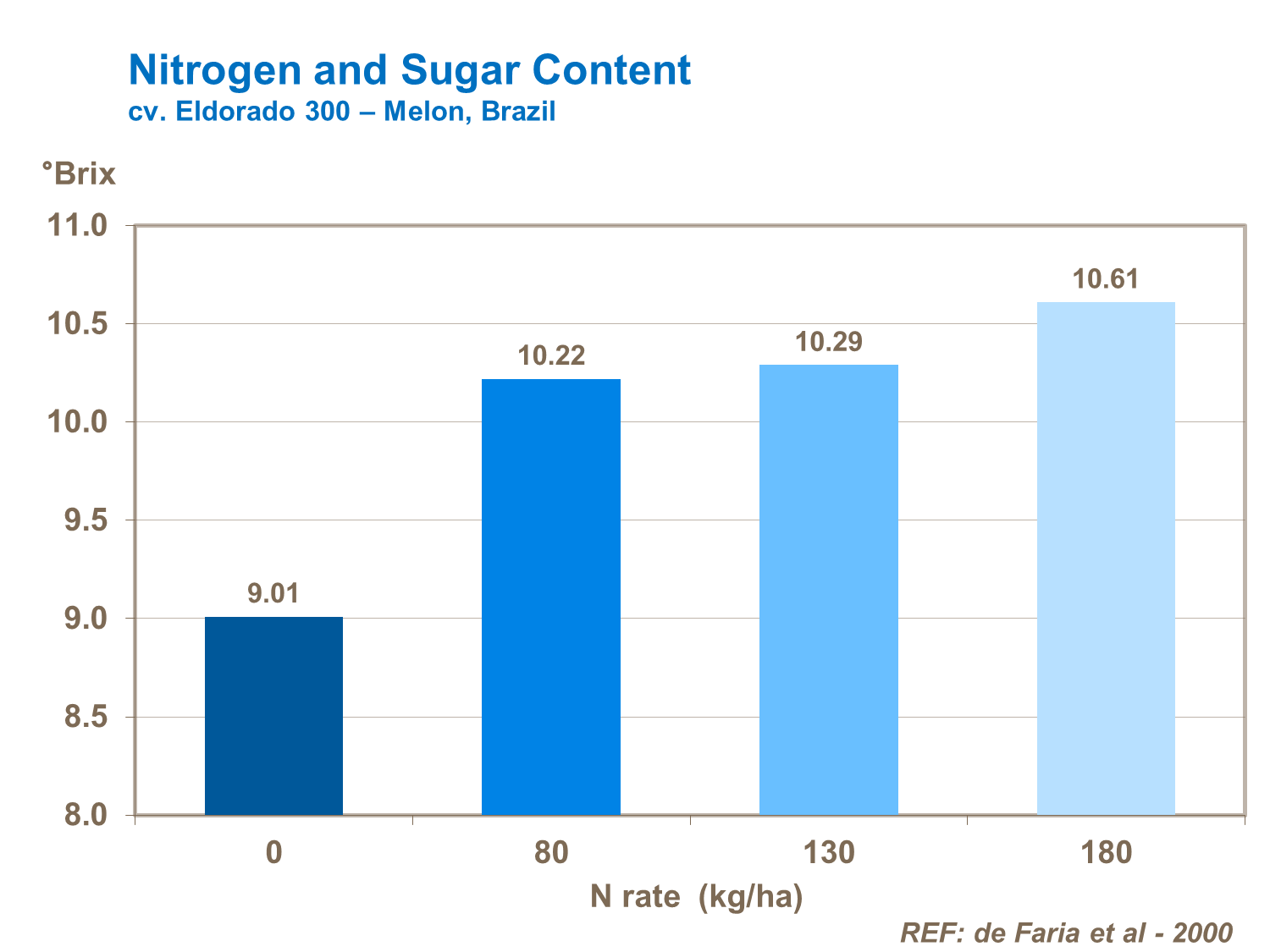 Right amount of nitrogen supply is important to boost leaf growth and sugar synthesis, improving fruit quality. Nitrogen form is particularly important and it is critical to maintain a good balance between ammonium and nitrate forms to maintain fast growth and good crop productivity. Trials confirm significant reductions in nitrogen uptake by leaves and yield losses from use of nitrogen-fertilizers with too high a proportion of ammonium compared to nitrate. Crop quality also deteriorates.