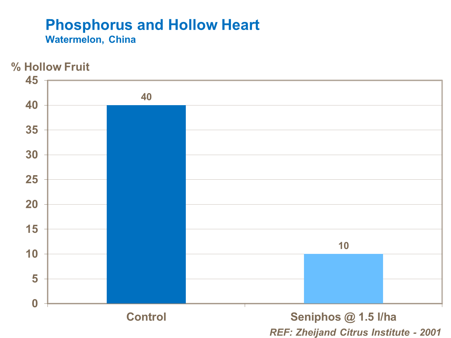 Foliar phosphate can reduce melon fruit hollow-heart and white heart. The use of foliar phosphorus prior to harvest has been shown to reduce the incidence of hollow heart in watermelon.