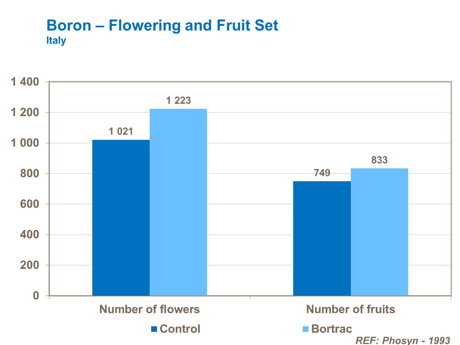 Boron has a key role to play in flower pollination and fruit formation (trials in Italy).
