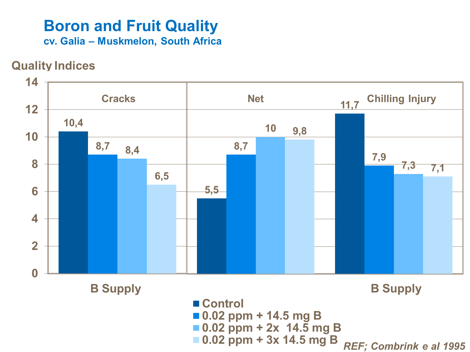 Boron helps to maintain the integrity of the fruit skin. Where supplies of boron are not limiting, skin is more elastic, thereby minimizing cracking and improving netting and storability (cv. Galia - Muskmelon, South Africa).