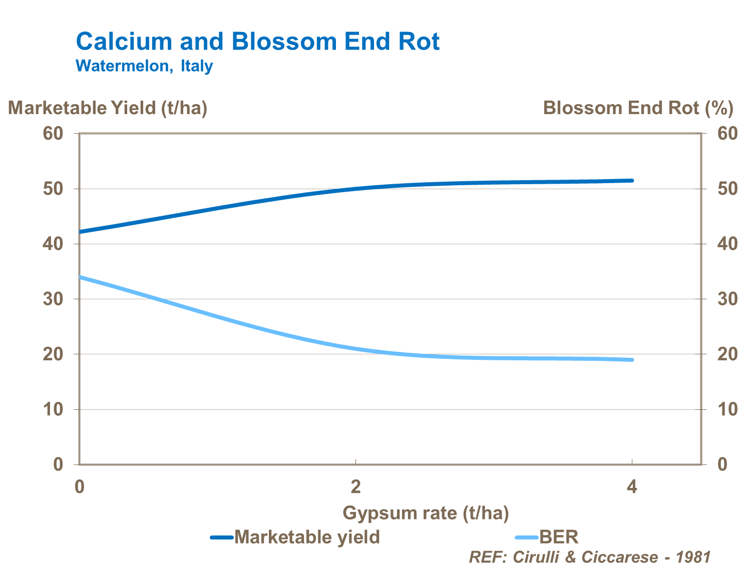 Fertilizer formulation also has a significant effect on quality characteristics and fruit disorders. Trials confirm that calcium nitrate is particularly effective at ensuring good fruit quality (cv. Congo - Watermelon, USA). This is largely because ammonium based fertilizers are antagonistic to calcium uptake. They also reduce soil pH and slow water uptake.