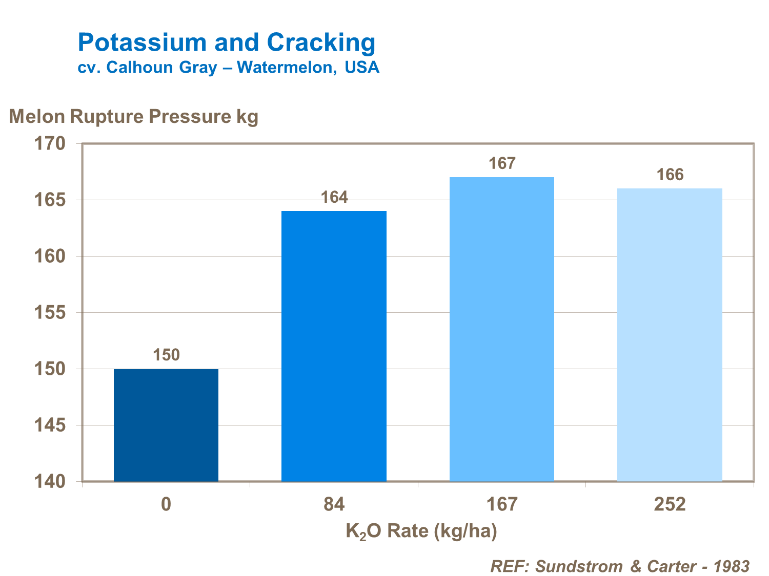 Melons have a relatively high potassium requirement compared to nitrogen, with over 170 kg/ha of potassium typically being utilized by high yielding 50 t/ha crops (cv. Calhoun Gray – watermelon, USA).