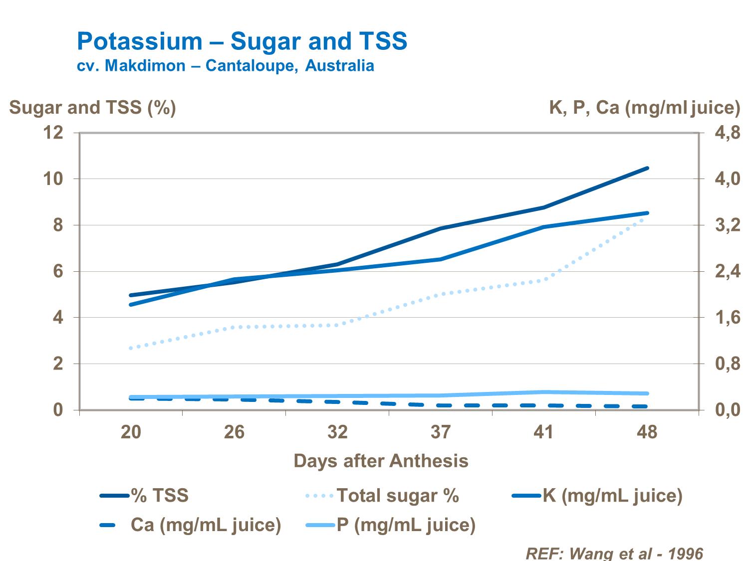 Potassium has a critically important role in ensuring top quality fruit by determining the level of sugars at harvest. It plays a key role in the transport of sugars to fruit (cv. Makdimon - Cantaloupe, Australia).
