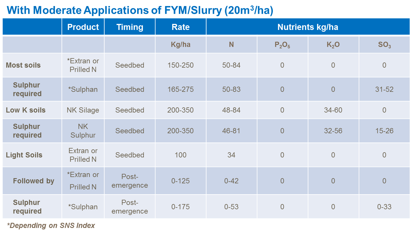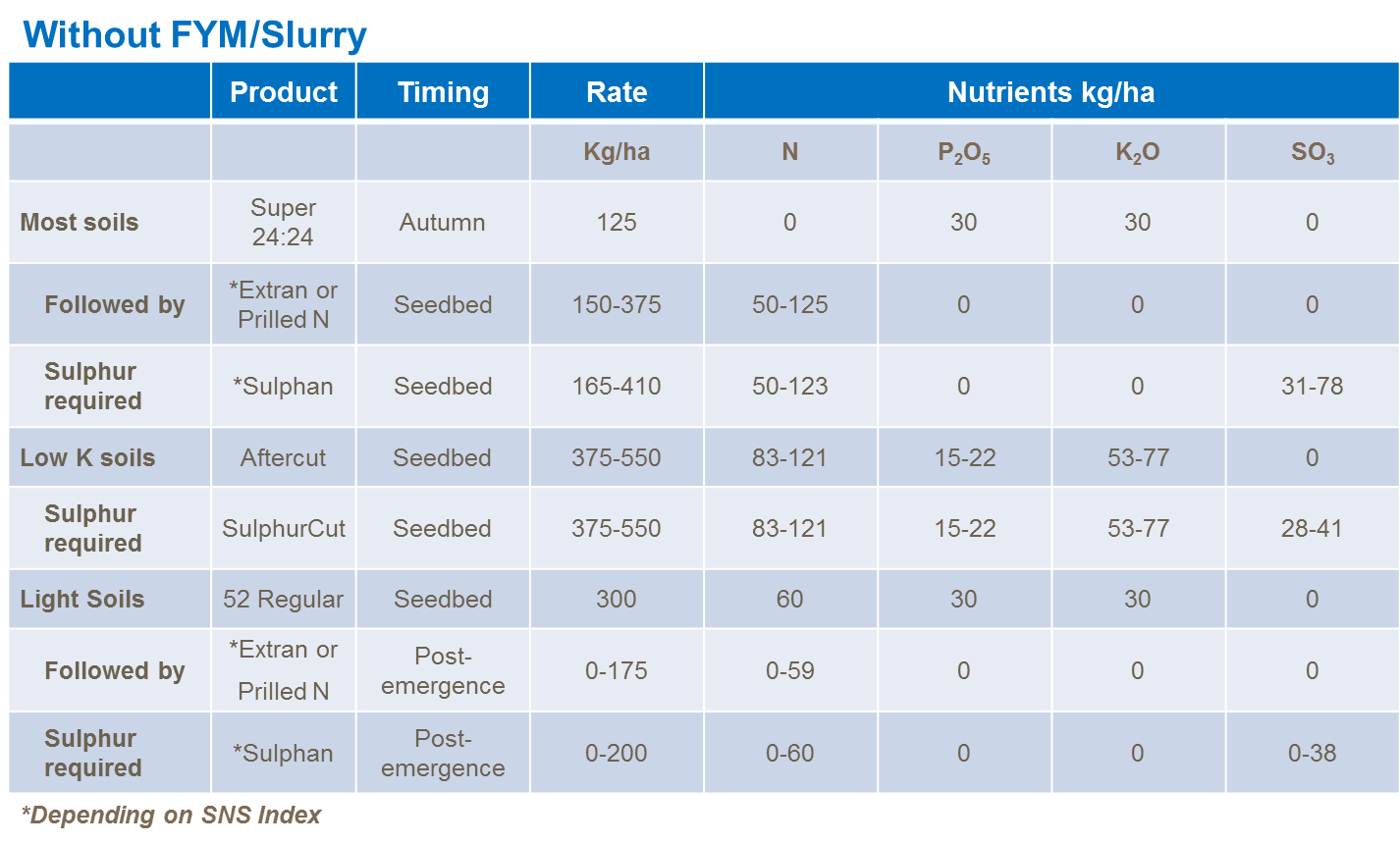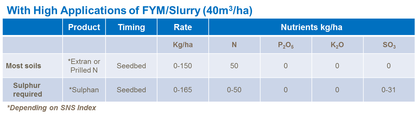 Crambe is responsive to fertilizer applications and its nutrient requirements are similar to those of a spring sown oilseed rape crop. Yield, oil content and quality are all enhanced by the use of nitrogen. Optimum yields in the UK have been achieved with applications of at least 150kg/ha nitrogen and 75kg/ha phosphate. A single application of nitrogen in the seedbed provides optimum performance, as it is available to the crop at the time of rapid growth. On light soils it may be advisable to split the nitrogen application, applying half to the seedbed or early emergence and half when the crop is 5cm (two inches) tall. For growers using liquid fertilizer, nitrogen should be applied to the crop pre-emergence to avoid the risk of scorch.