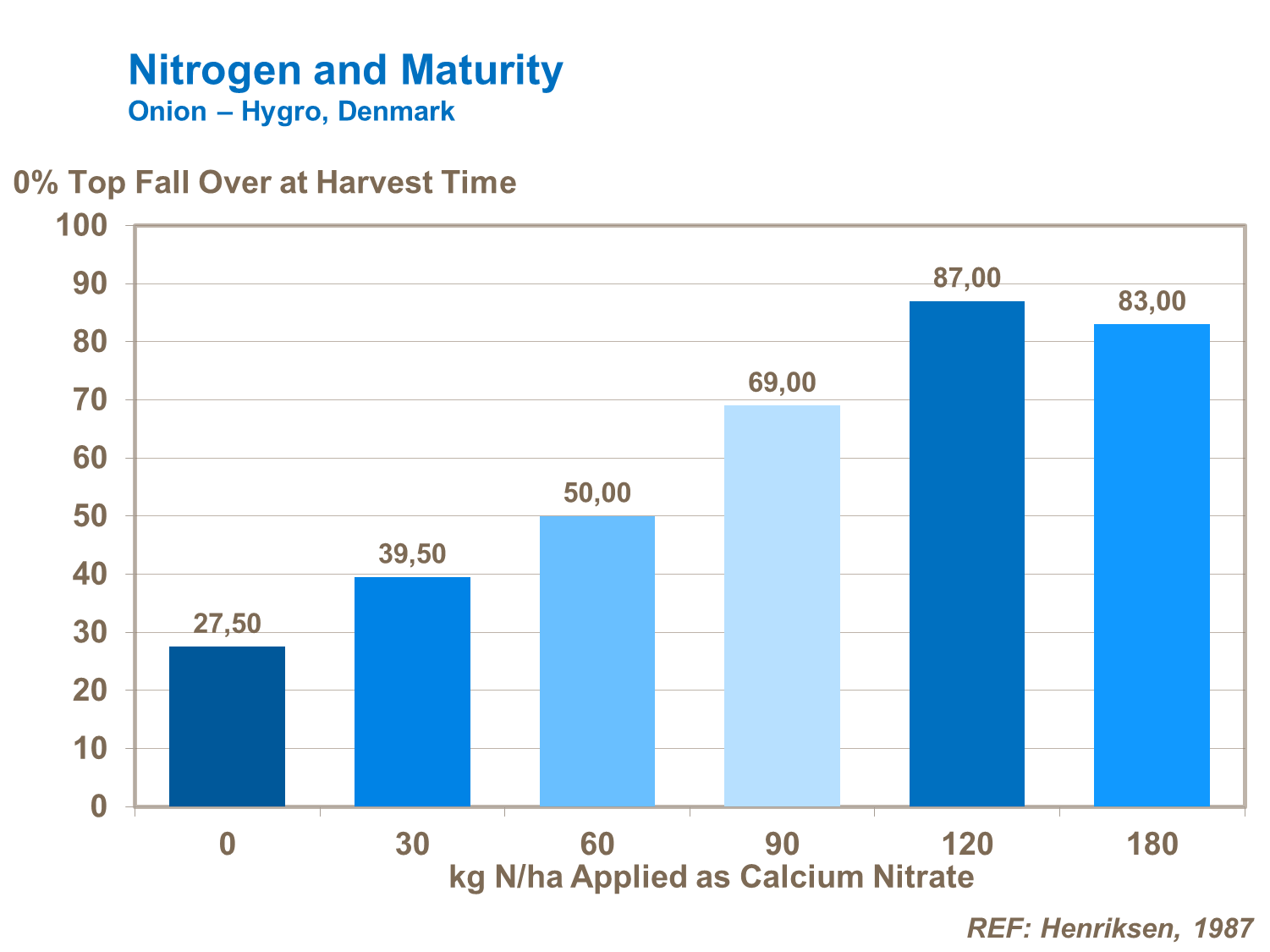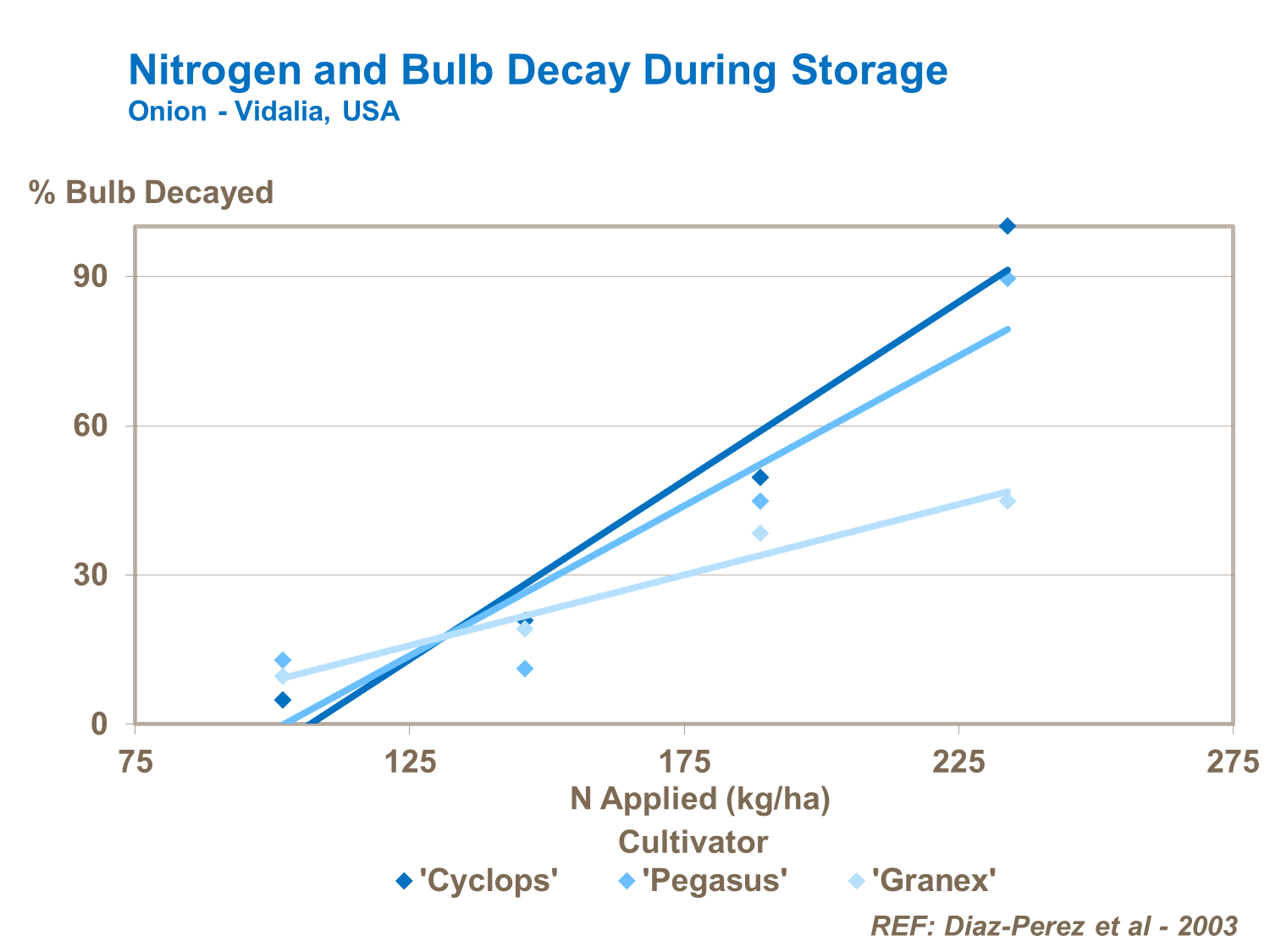 Care has to be taken since excessive nitrogen can result in bulb decay and storage rots, causing yield losses in store. Excessive N can also weaken plant tissues increasing susceptibility to cold damage (USA studies).