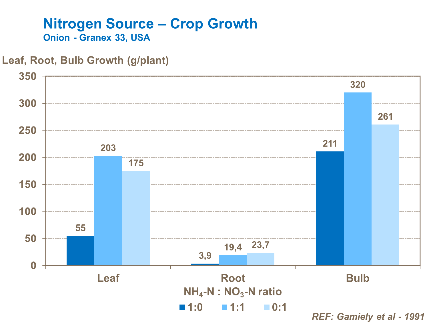 Trials confirm that a balance between nitrate and ammonium-N is most effective at promoting leaf and bulb growth. However, during later stages of growth, nitrate forms boost yield by providing higher dry matters in the bulb (trials with Granex 33 Onions, USA).