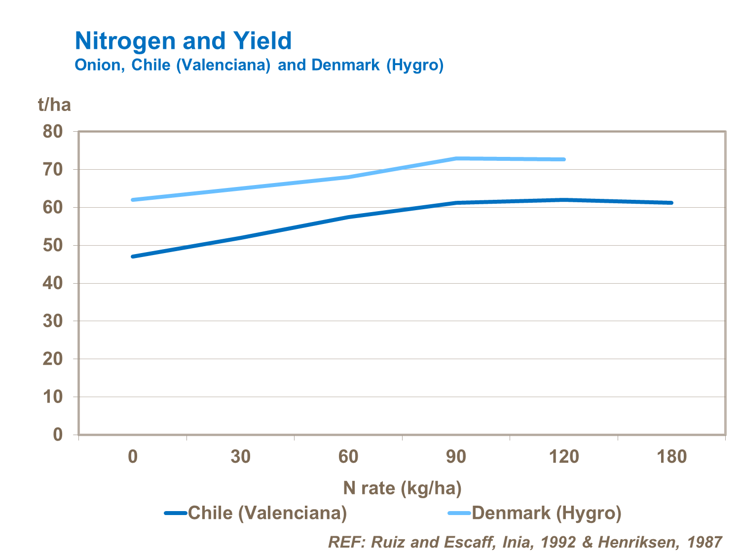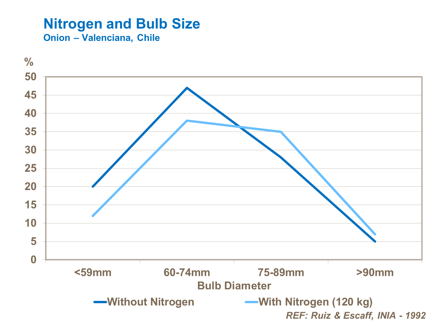 High rates of nitrogen are also important for onion size. The more N-applied the more leaves and hence the number of bulb scales produced, and the bigger the harvested bulb (trials with Valenciana Onions, Chile).