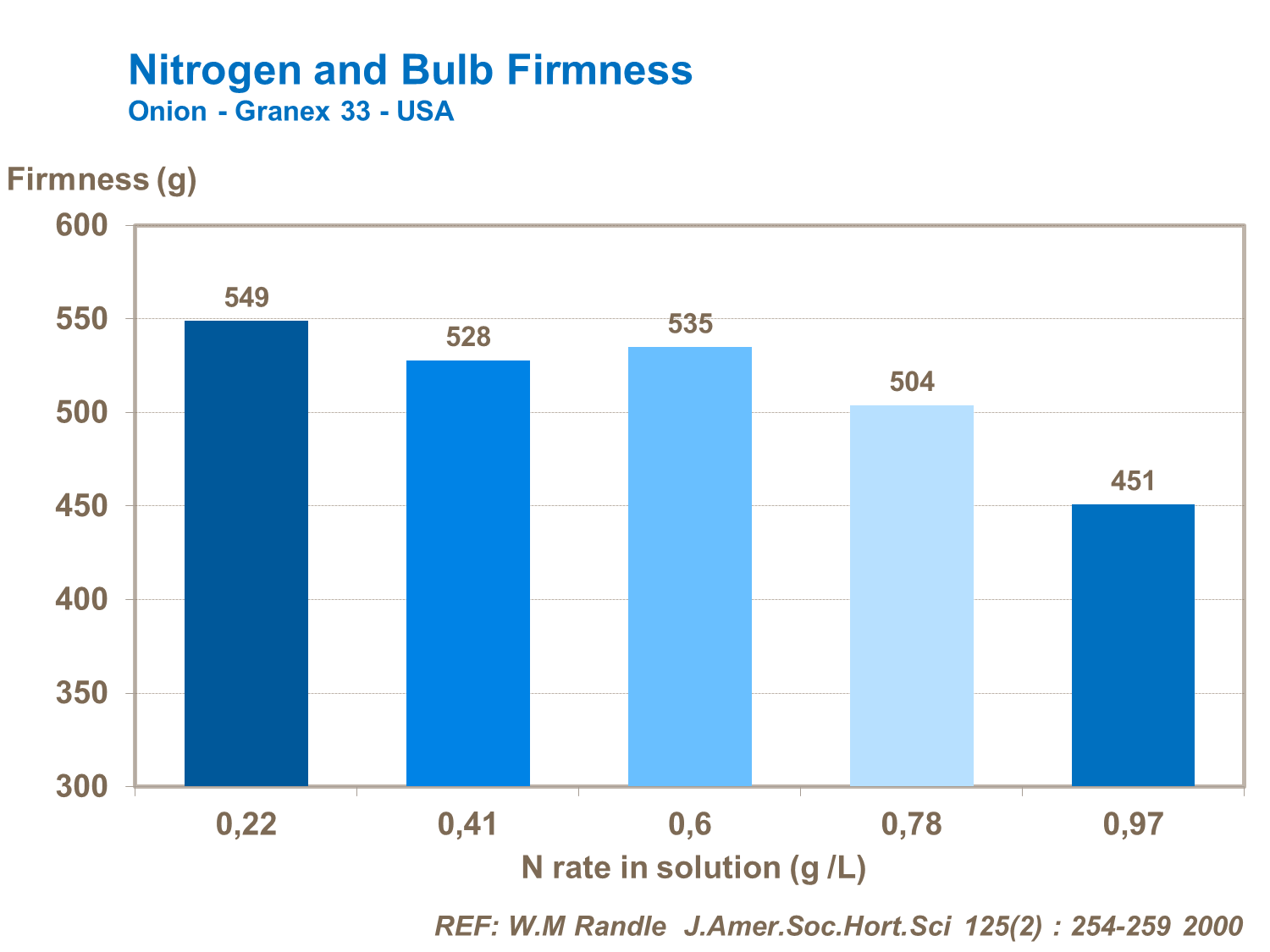 Although nitrogen can also help to improve the bulb’s resistance to pressure by increasing the specific weight of the outer skin, reducing damage handling and storage, overall bulb firmness may decrease with high rates of nitrogen due to a softening of internal tissue (trials with Granex 33 Onions, USA).