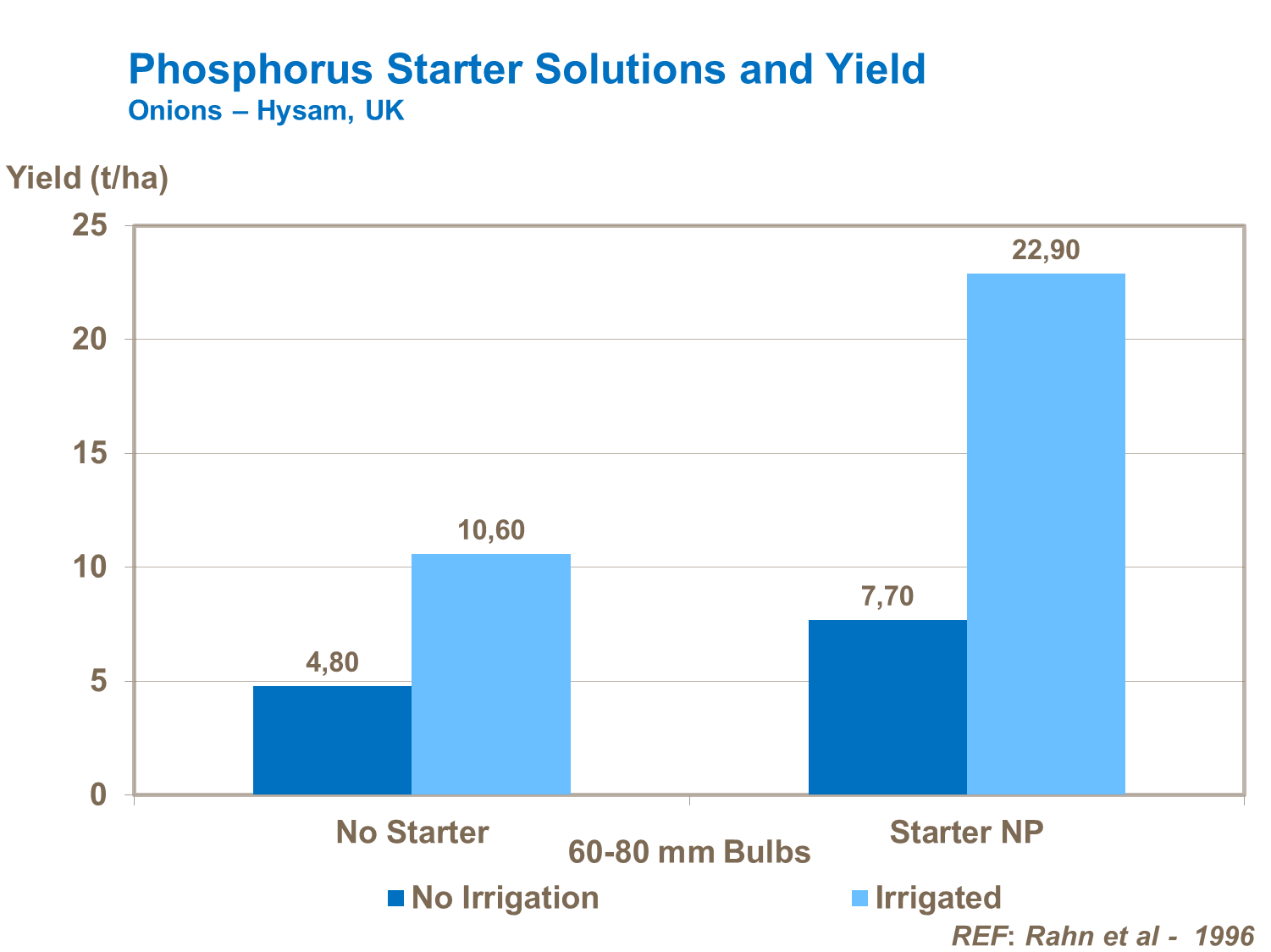 Growth, yield and grade quality improvements are commonly seen when using starter fertilizers in onions. The figure above showns yield increase in UK trials.