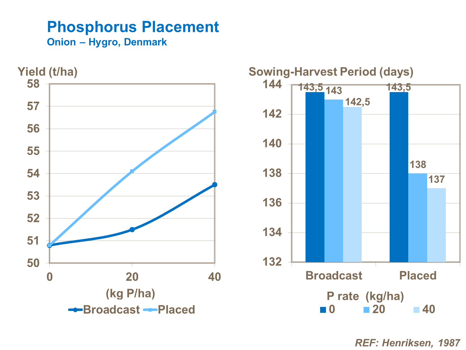 Phosphorus is rarely required in large quantities. However, where crops are grown on soils with very low natural P levels, higher rates are required to boost yield and bulb size. It is important that phosphorus is available early season in order to encourage growth, particularly of the root system. Placement of phosphorus within the root zone has been shown to work better than when P-fertilizer is broadcast.