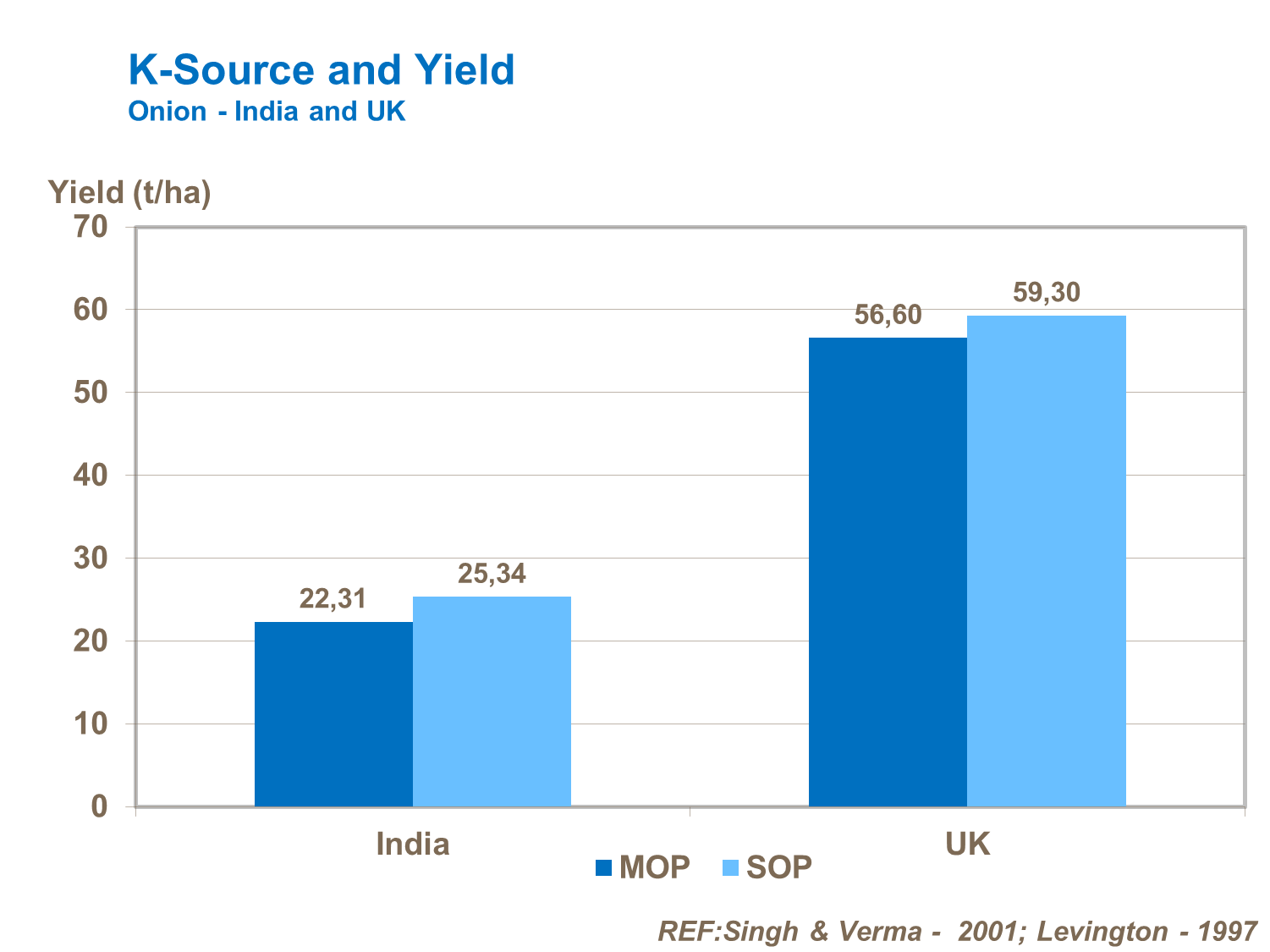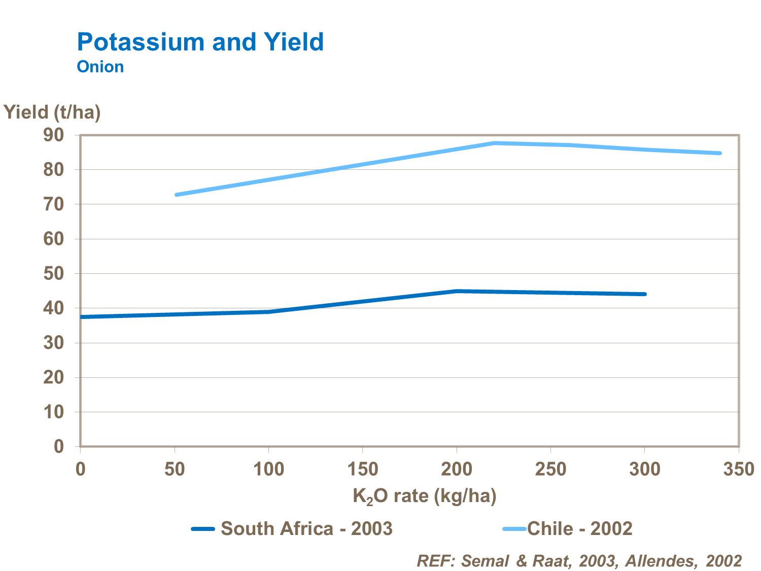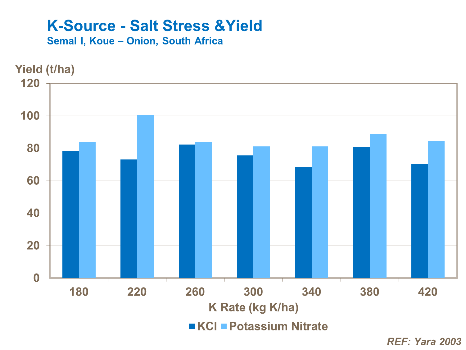 Onions are very prone to salt stress, so it is important to use sources of potassium less likely to cause damage, particularly in drier regions and where irrigation is used. Widespread use of muriate of potash can result in high levels of chloride in the plant, leading to loss of yield and bulb weight in store compared to other forms of potassium fertilizer (trials in South Africa).