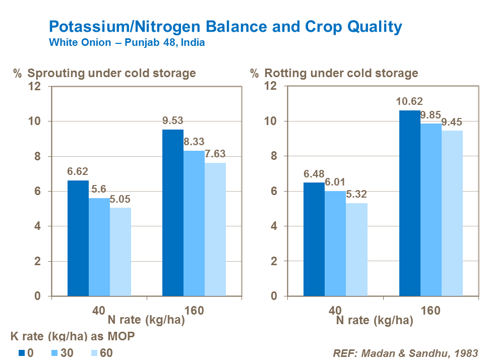 Use of potassium allows growers to maintain high rates of nitrogen for yield with reduced risk of storage problems such as rots or sprouting, as studies with White Onions in India show.