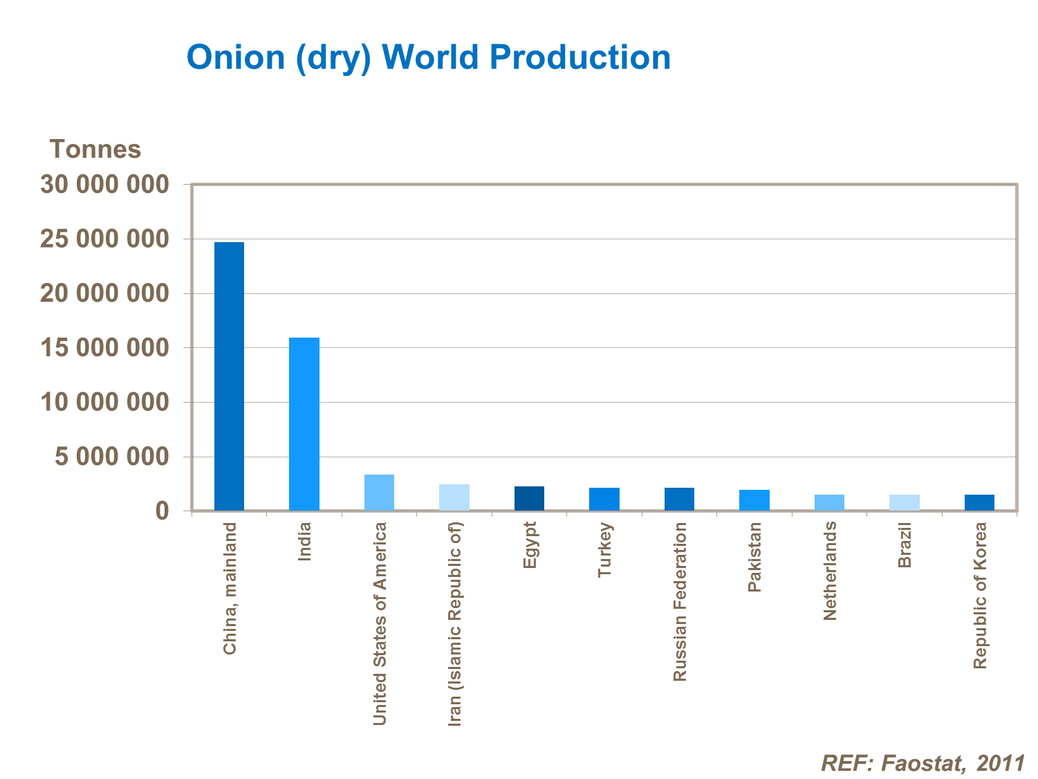 Biggest producers are China, India and the USA. Between them, these countries produce around half of the world’s dry onions.
