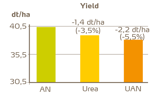 Recent field trials in France revealed significantly higher performance of ammonium nitrate when compared to urea and UAN. Better results were recorded in all three areas of interest: uptake efficiency, yield and oil yield (figures 7). Lower efficacy of urea and UAN reduces the N uptake by 15 and 30 kg N/ha respectively as compared to AN and causes therefore avoidable nitrogen losses through volatilization and leaching.
