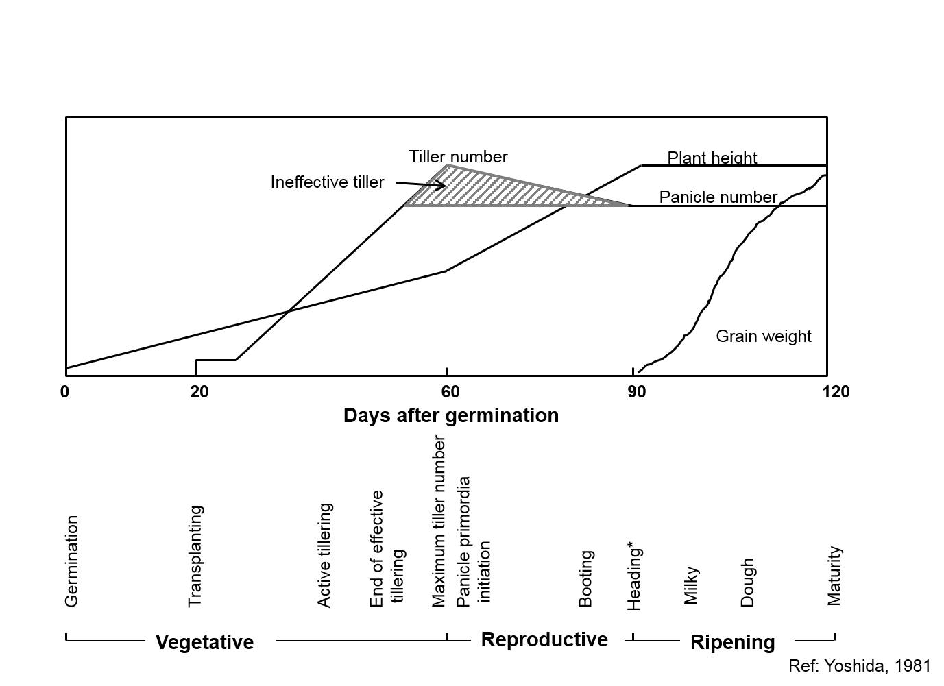 Vegetative stage: tillering, gradual increase in plant height and leaf emergence. Start of tillering: ca. when the 5th or 6th leaf develops.