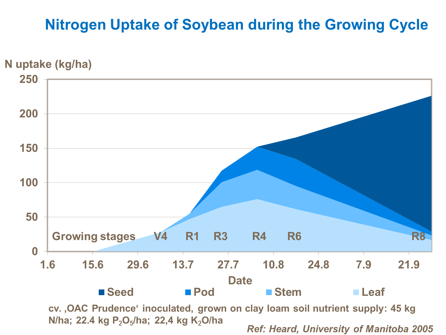 Soybean is able to fix most of the N the plant needs through its symbiotic relationship with rhizobium bacteria. But it can also take up residual and mineralized N from the soil. Traditionally, soybean has been grown successfully without any addition of N fertilizer.