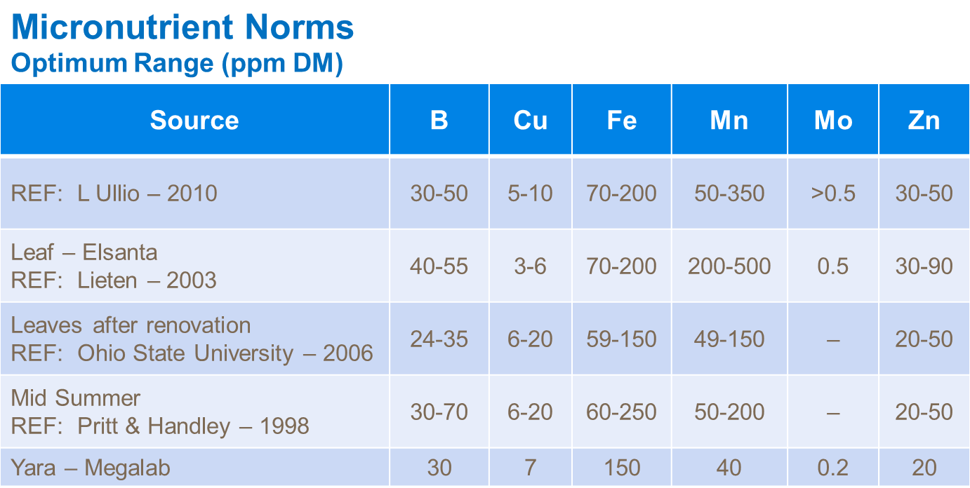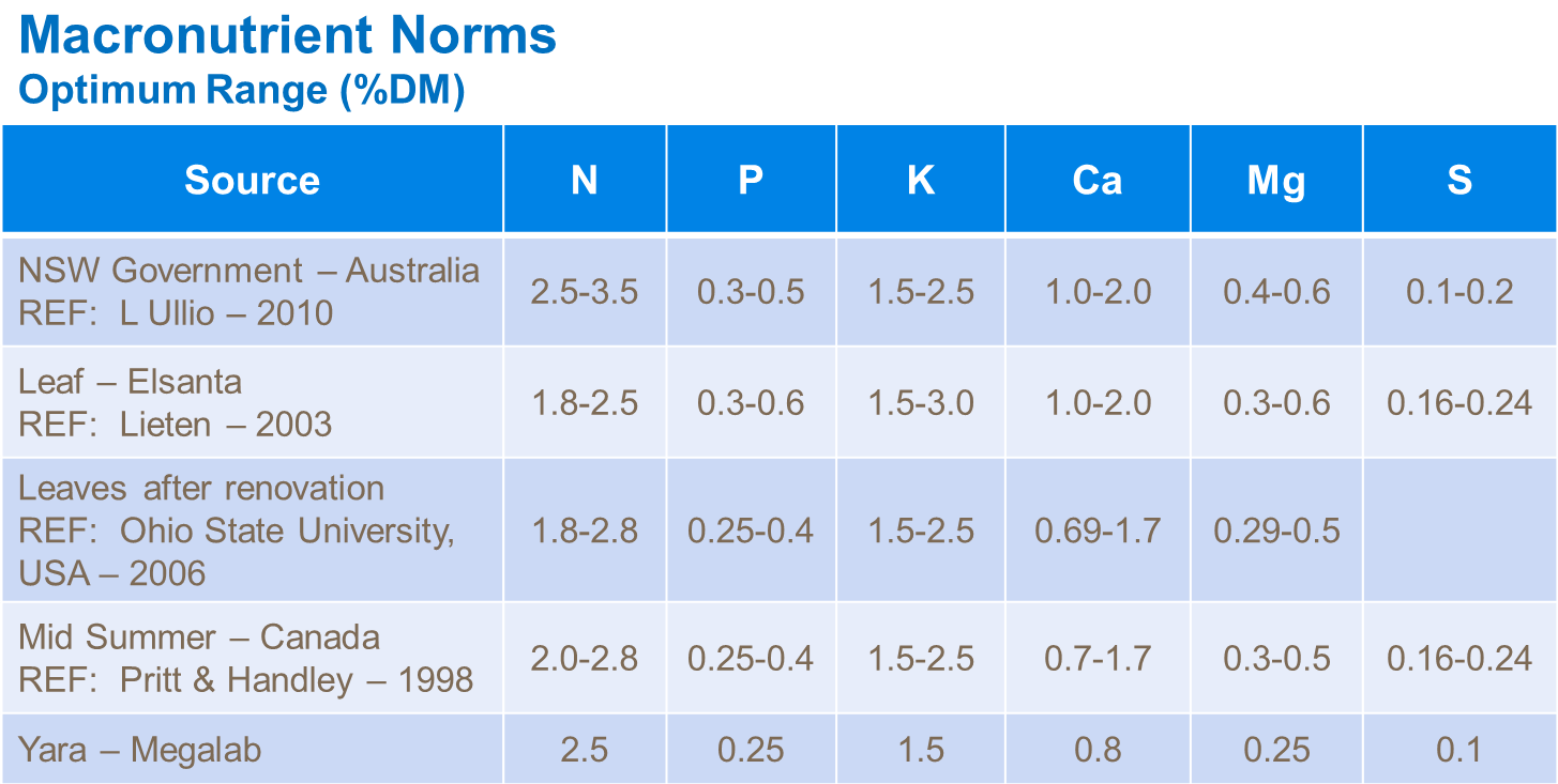 Leaf tissue analysis will also confirm most visible deficiency symptoms, reveal hidden deficiencies where visual plant symptoms are not yet present and show excessive nutrient concentrations which may be causing other nutrients to be deficient – e.g. excess K supply creating an imbalance of calcium or magnesium.
