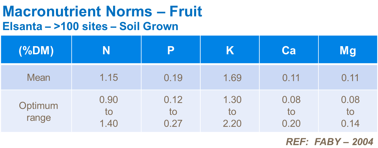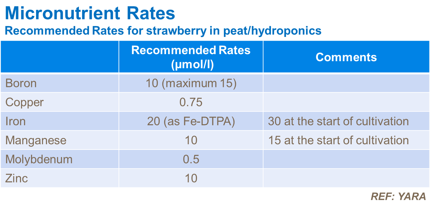While fruit analysis is not commonly used, Table 10 gives an indicative range for macronutrients in fruit. Table 11 gives Yara’s standard recommendation for use of micronutrients for strawberry grown in peat/hydroponics.