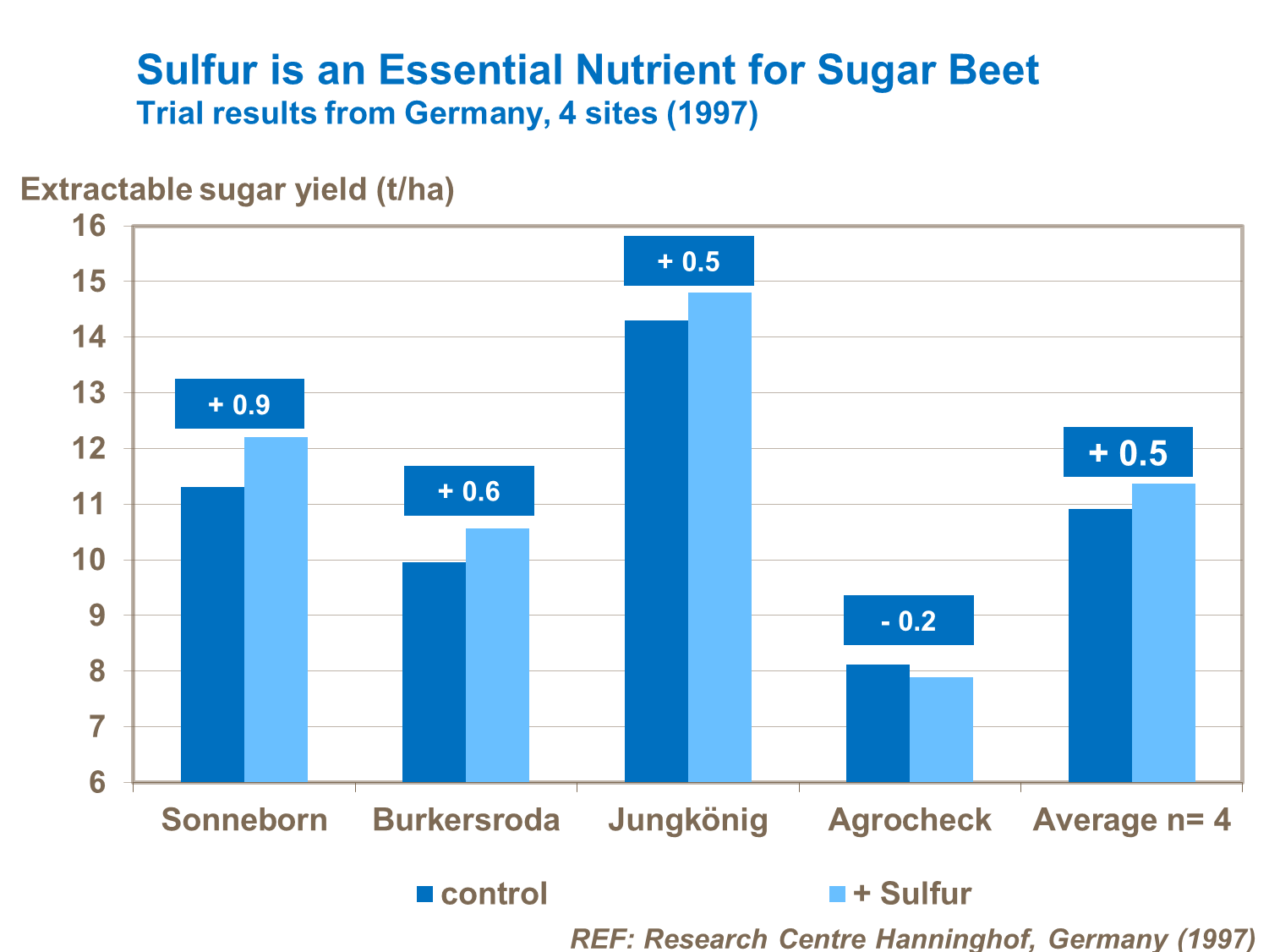 Sulfur is an important component of all proteins and enzymes, and with the protein in greatest quantity being chlorophyll, deficiency can severely reduce yield. The sulfur uptake of a 50 t/ha sugar beet crop is approximate 32 kg S/ha, with 14 kg/ha in the leaves and 18 kg/ha in the roots.