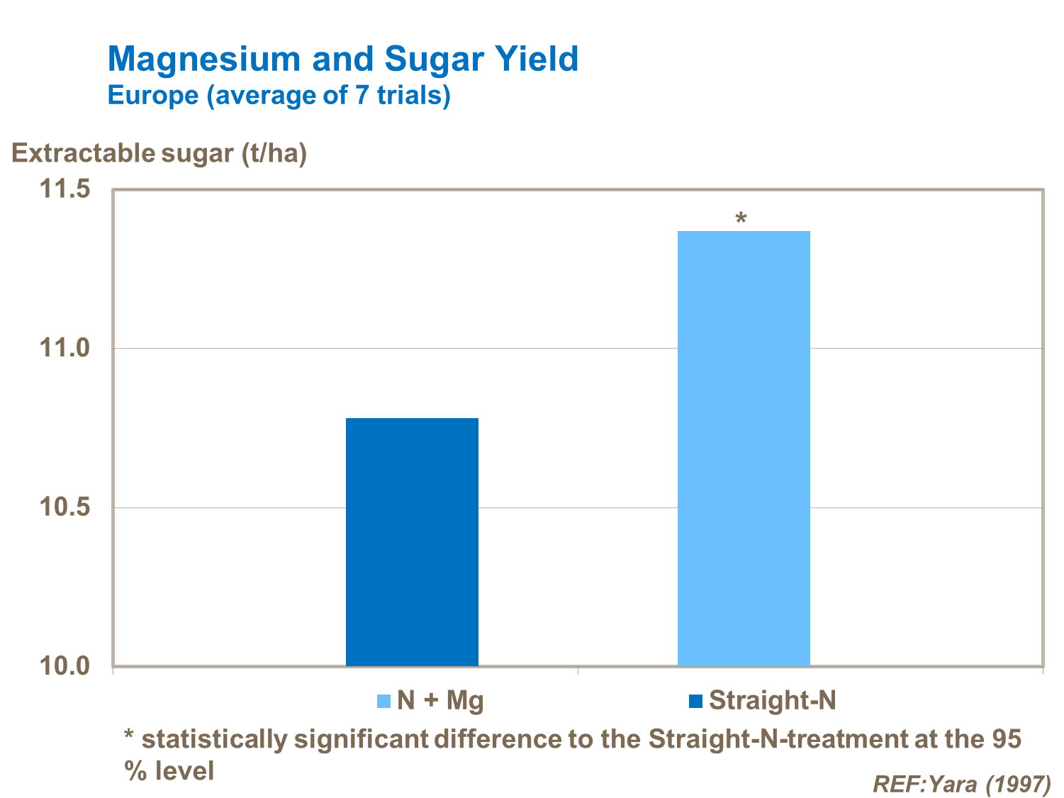 The magnesium uptake of a 50 t/ha sugar beet crop is approximate 44 kg Mg/ha, with 24 kg/ha in the leaves and 20 kg/ha in the roots.