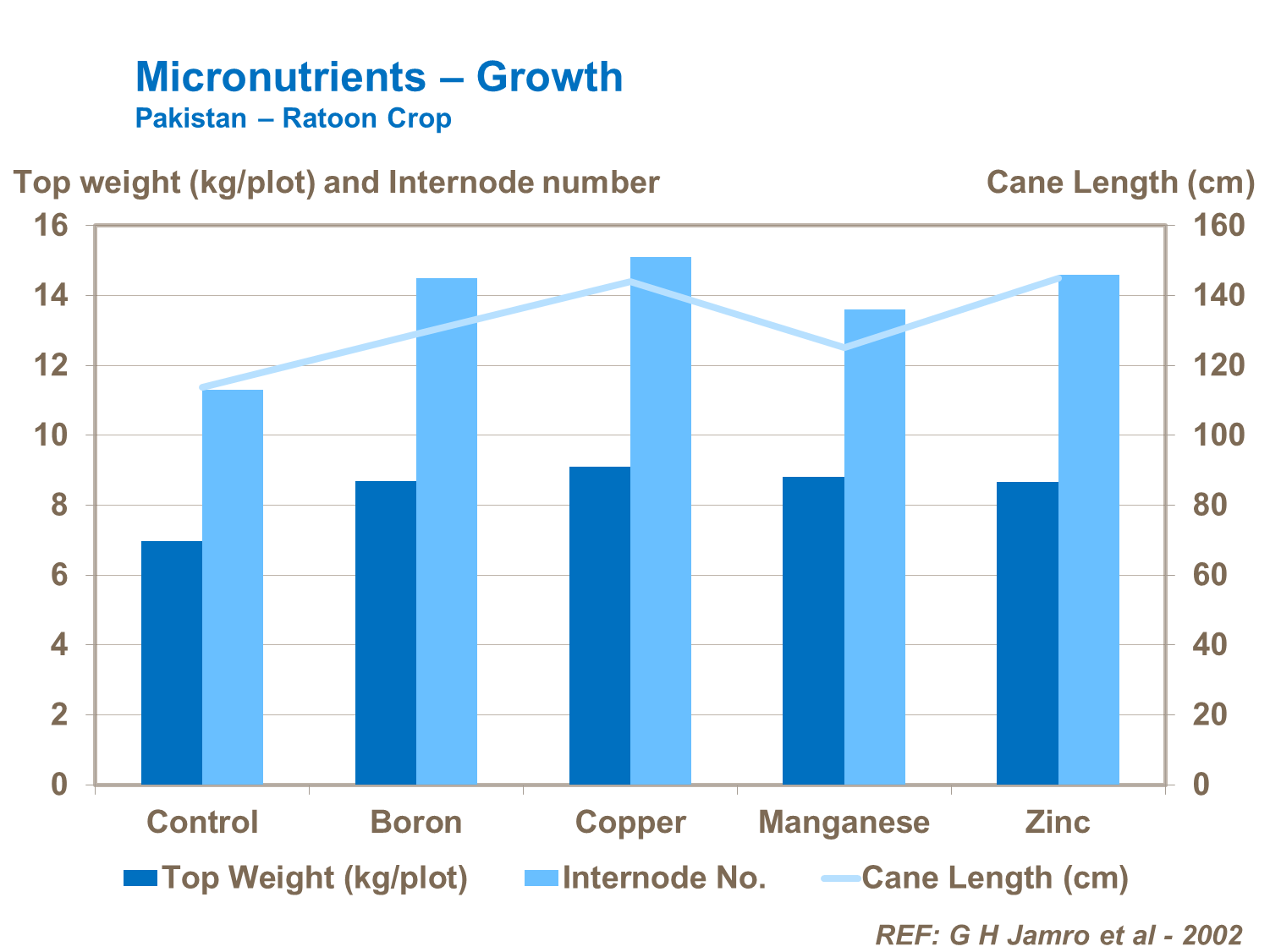 There are numerous examples of positive responses in terms of growth and subsequent cane and sugar yield in the scientific literature. Figures 46, 47 and 48 highlight some of this research and indicate responses where micronutrients are in short supply.