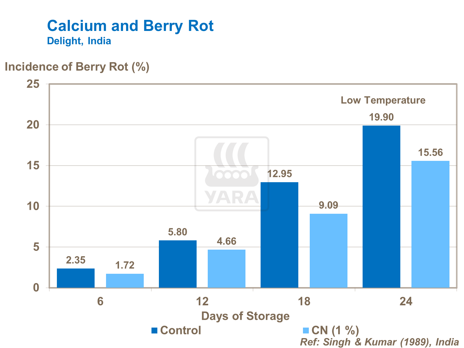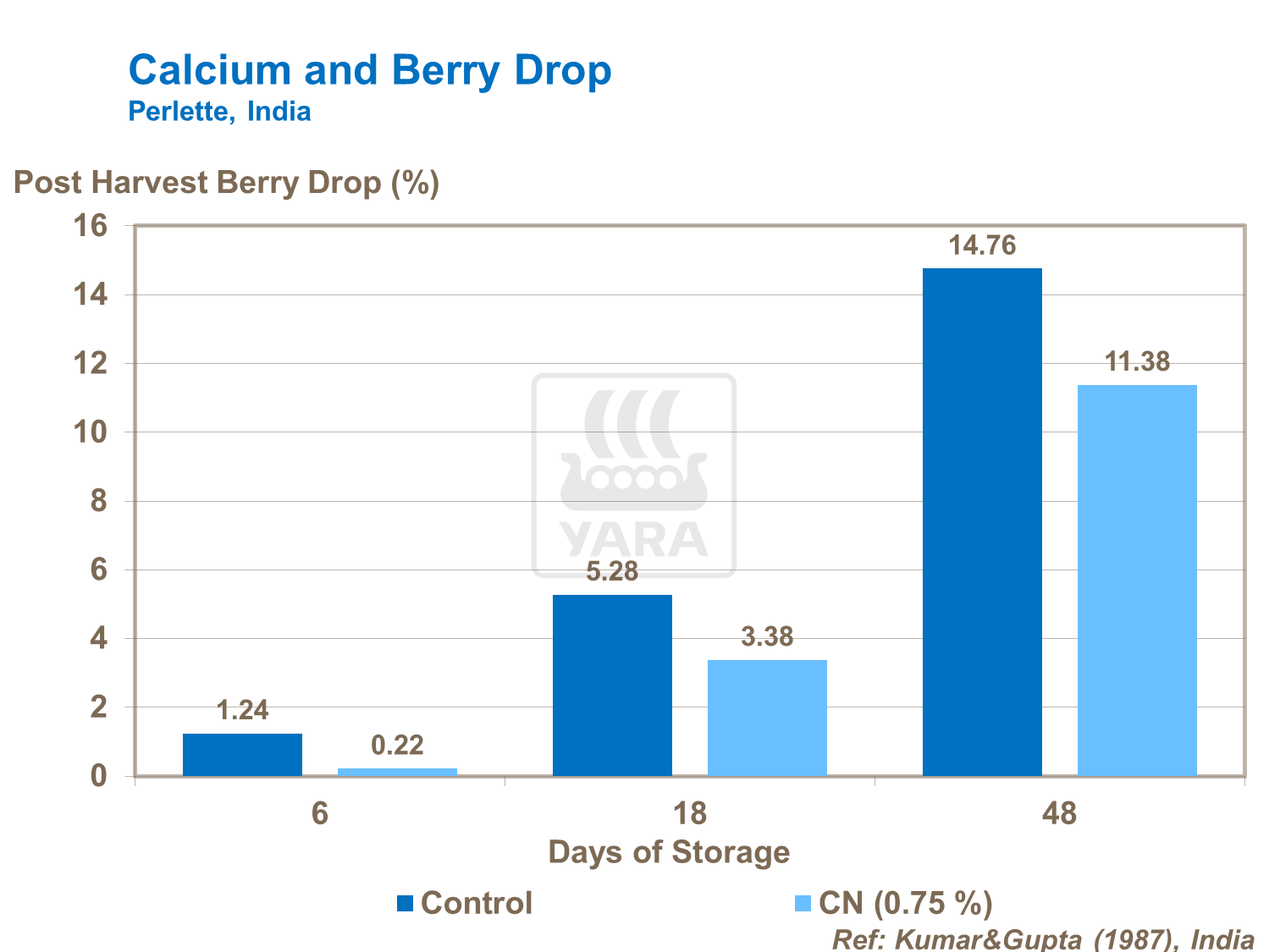 Calcium plays an essential role in lignification and wood maturity. It enables the table grape to tolerate frost and diseases. Application of calcium nitrate reduces the incidence of post-harvest rots in table grape.