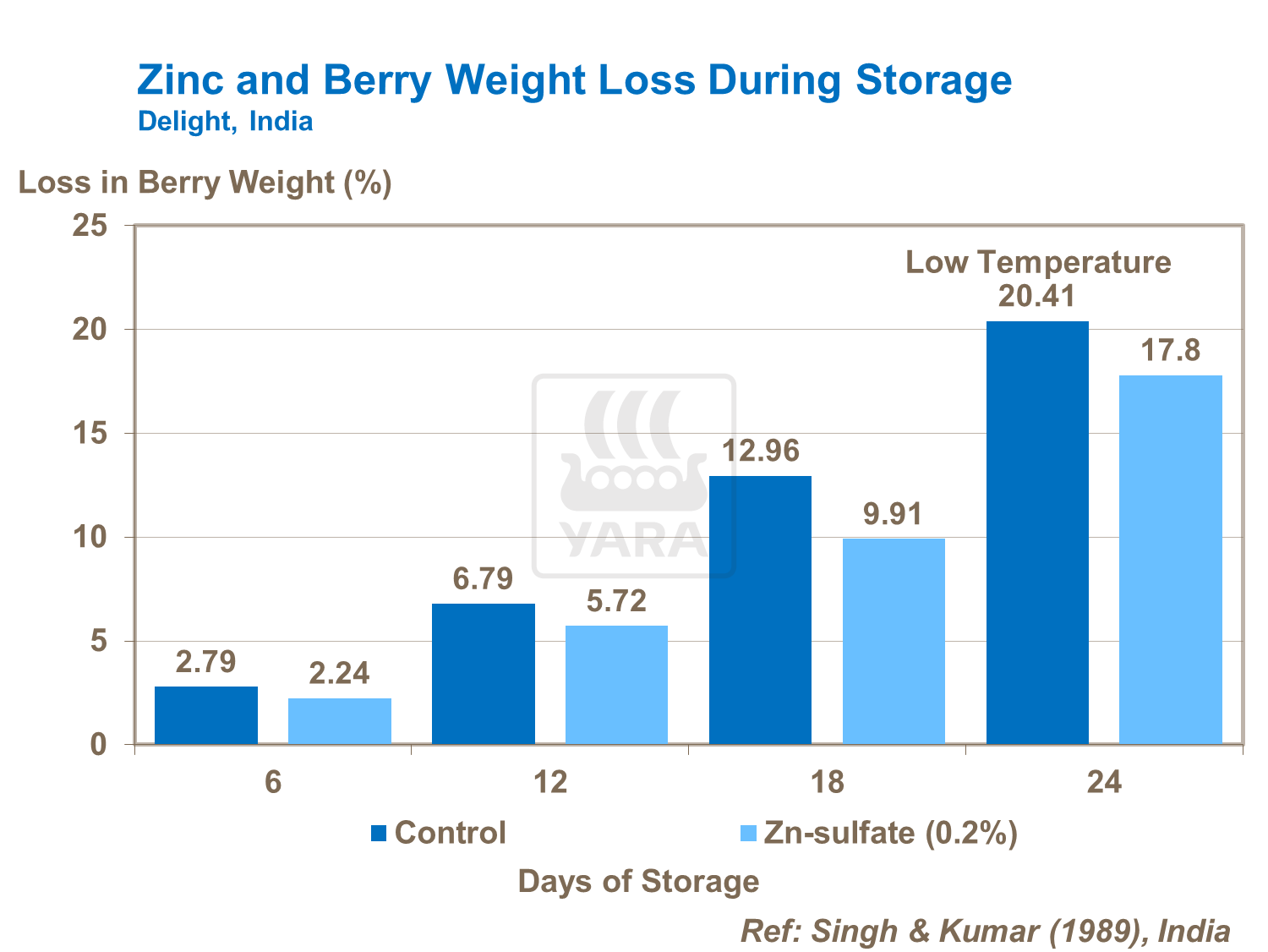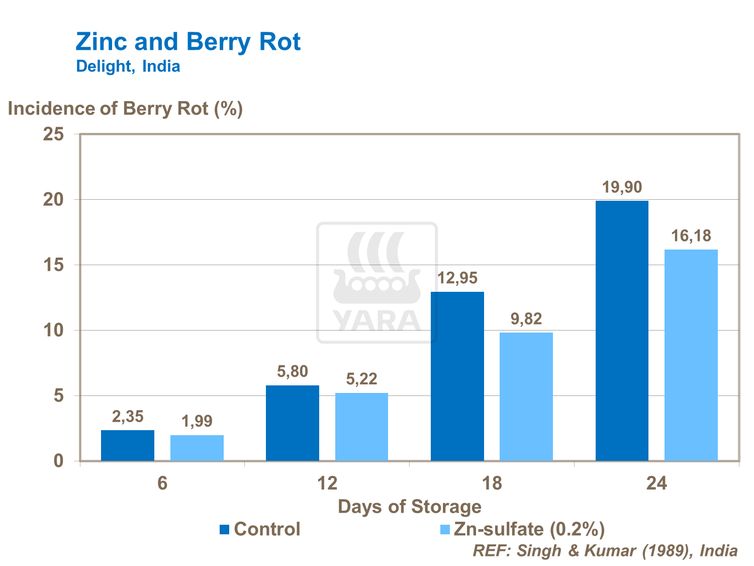 Zinc deficiency limits healthy growth of the crop. It plays an essential role in the cell multiplication process. Application of zinc fertilizer has a positive effect on berry weight and berry rots in store.