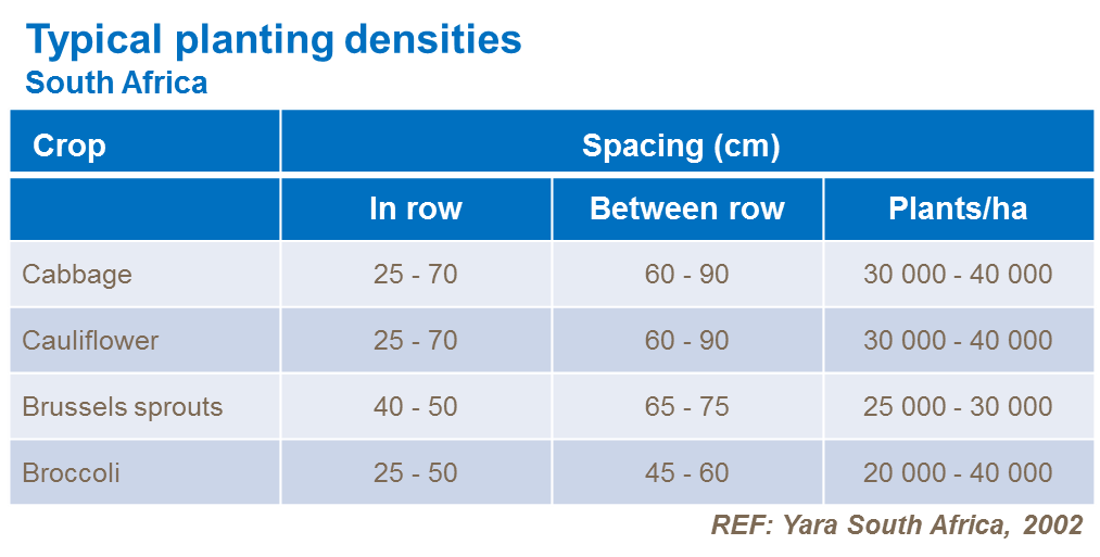 Spacing varies according to brassica type, the speed of growth and harvest method . If the aim is to produce smaller heads, particularly in fast growing conditions, then a denser spacing is used. Wider spacing produces larger heads.