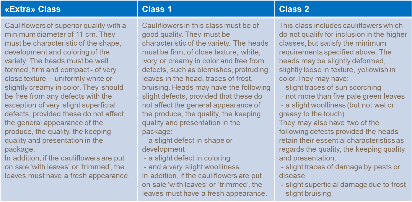 Common practice in the fresh market is to trim leaves from around the mature curd once it reaches 15-20cm size. Cauliflower is also extremely perishable and even under cold storage conditions should only be stored for a short time. Again, grading is commonplace. In the EU, there are three recognized grades:
