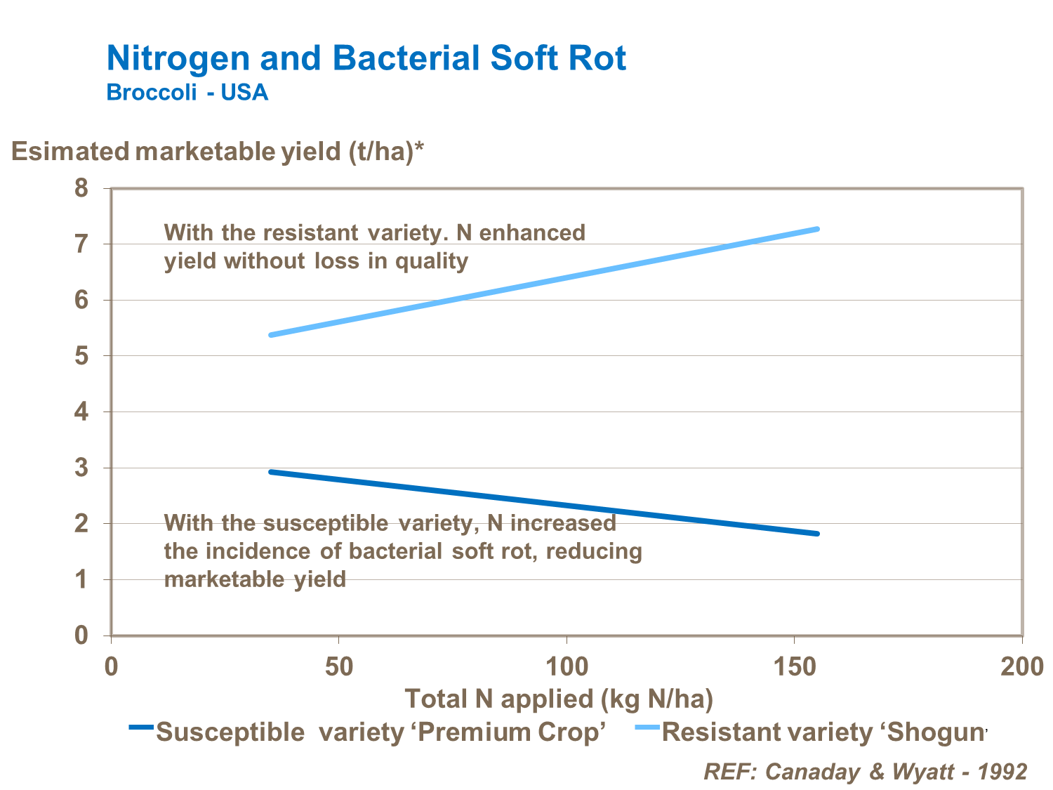 Black Petiole is due to a collapse of the cytoplasm in the parenchyma cells and believed to be associated with a potassium and phosphorus imbalance when the potassium level in the soil is low and the phosphorus concentration high. High rates of nitrogen may also contribute to the problem. Black petiole tends to become more evident when cabbage has been stored for a period of time. Soft rot can become a problem in broccoli when optimum nitrogen is exceeded.