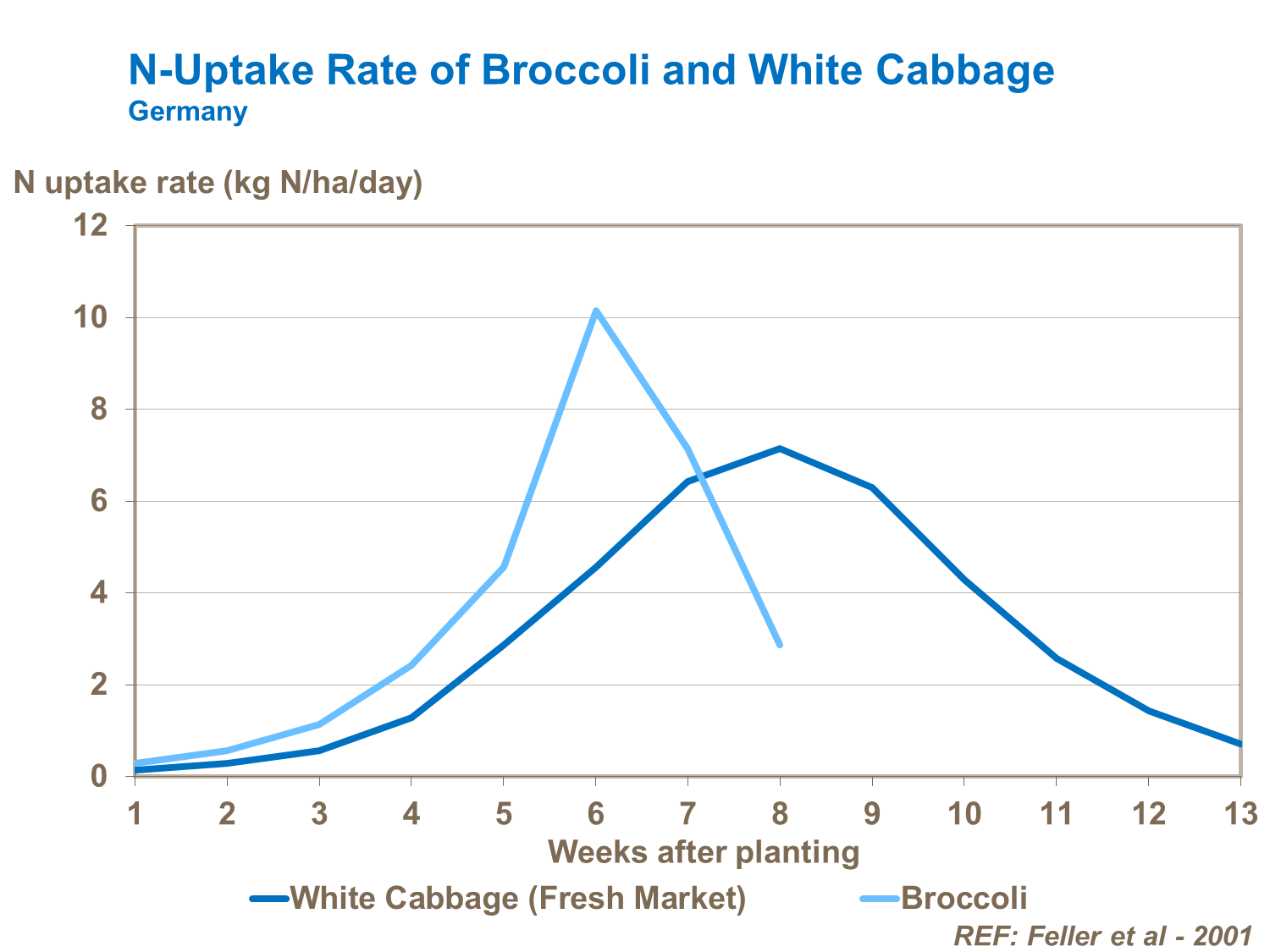 Slower developing types (e.g. cabbages) – particularly those growing at lower temperatures and lower radiation conditions – take longer to utilize the N needed for high yields